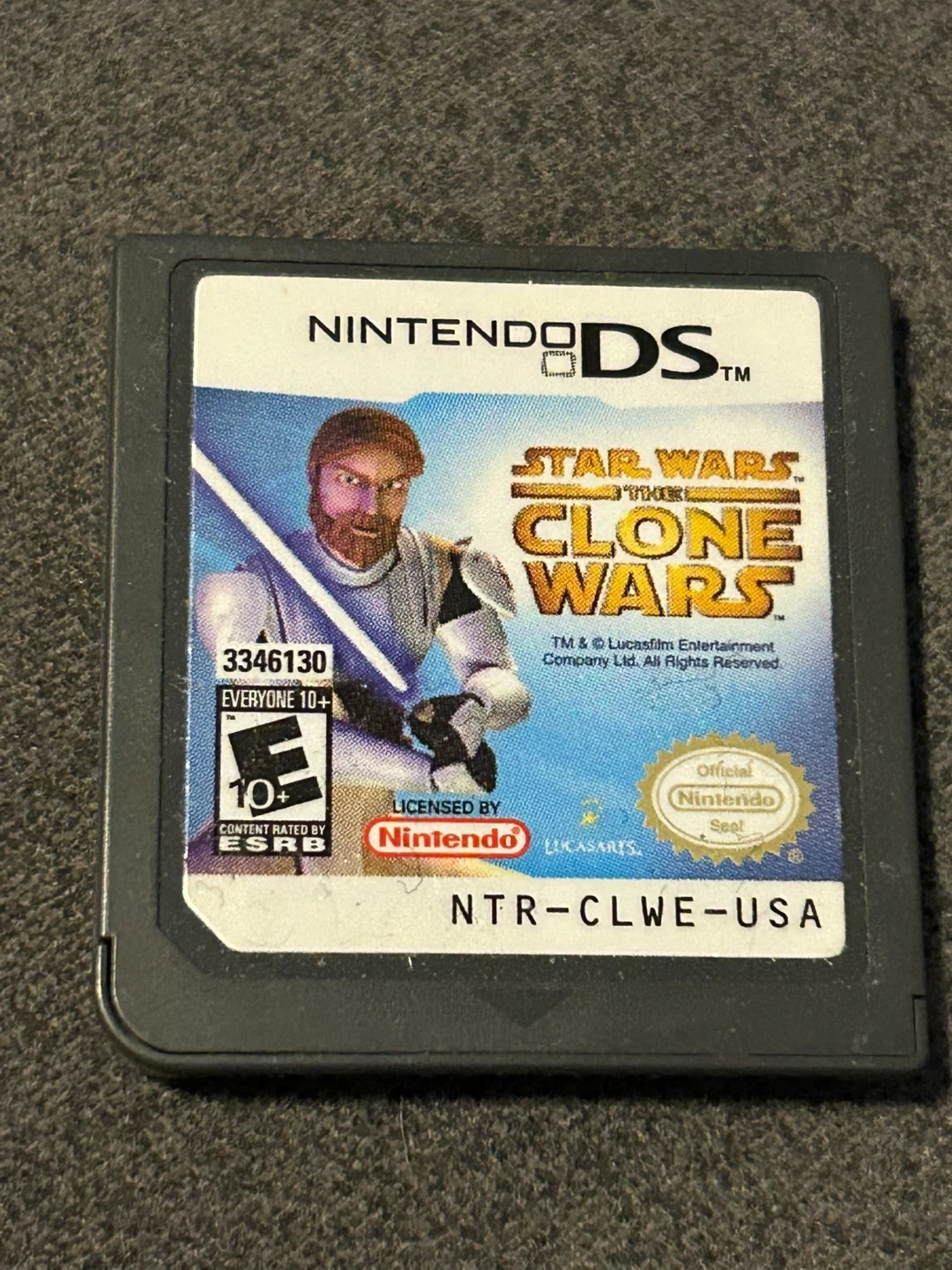 This is Star Wars The Clone Wars for Nintendo DS. It's rated E for Everyone 10+ by ESRB. The game is licensed by Nintendo. Model number NTR-CLWE-USA.