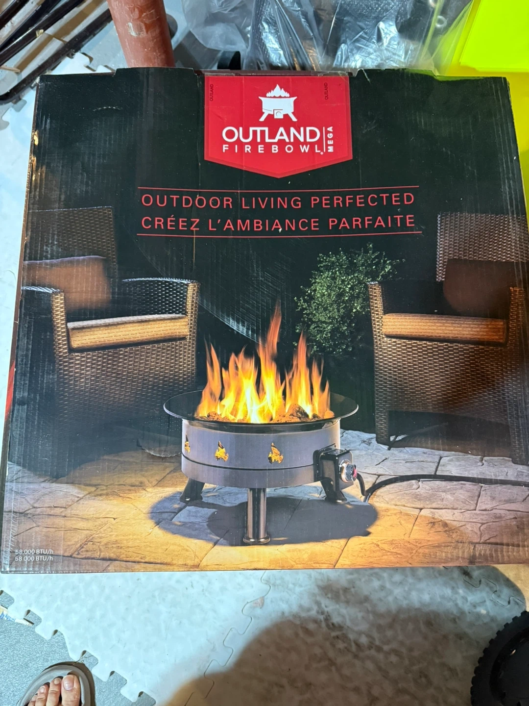 This Outland Living Mega Firebowl propane fire pit is perfect for any backyard gathering. It produces 58,000 BTU/hr for ample warmth. Includes lava rocks and a propane tank cover. It's made from durable steel.