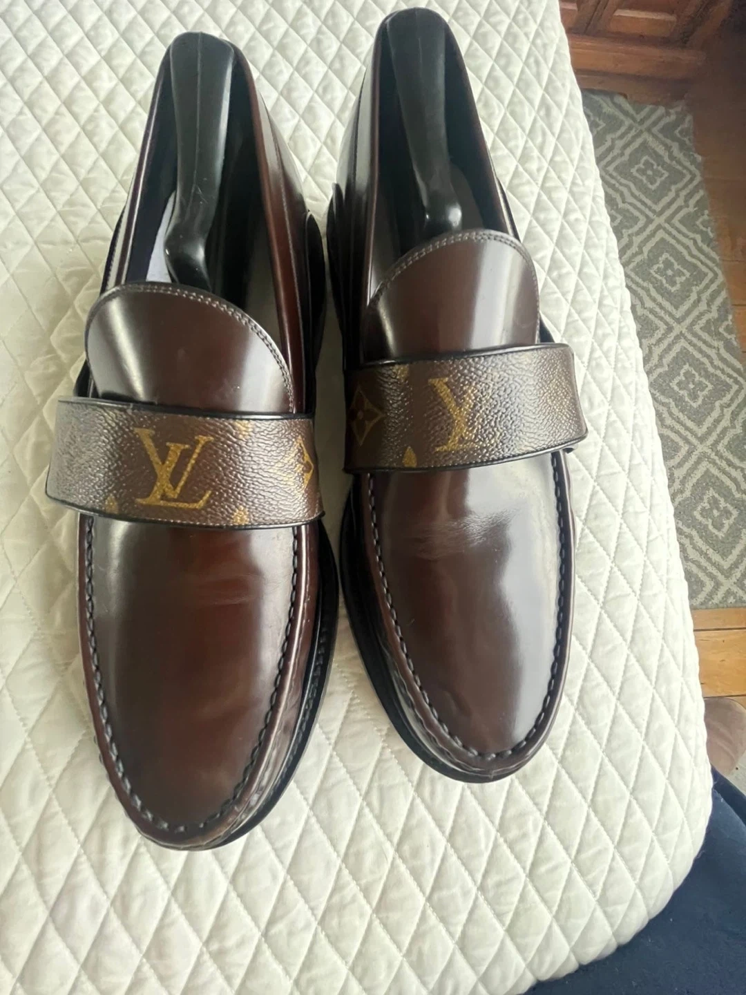 These are Louis Vuitton loafers in brown. They feature the signature monogram canvas strap across the vamp. Made in Italy. Leather soles.