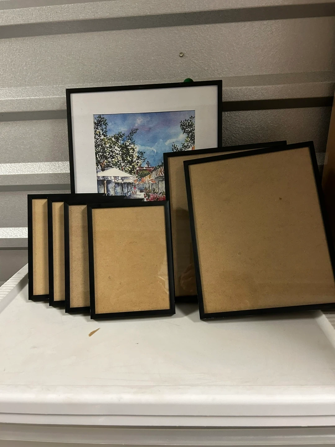 This set includes six black picture frames. It comes with one larger frame and five smaller frames. Black plastic material.