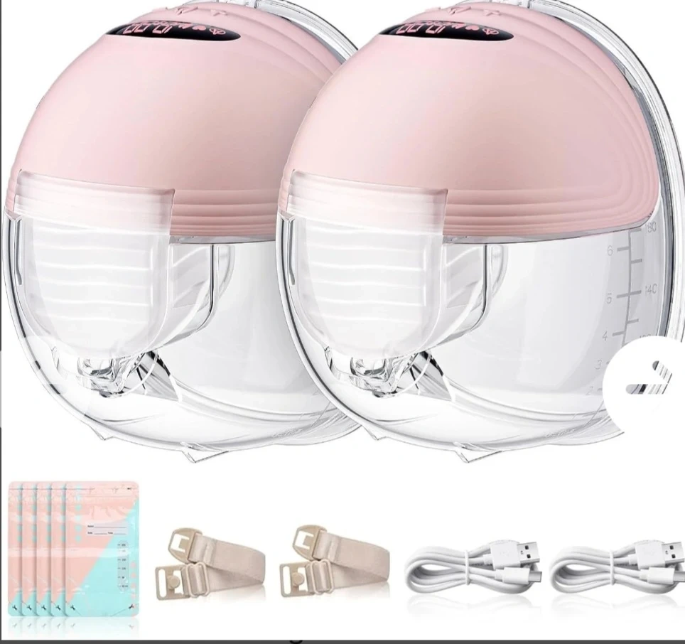 This is a pair of hands-free wearable breast pumps with a 24mm flange size. It includes bra adjusters and USB charging cables. The pumps are pink and clear with measurement markings. They feature a digital display.