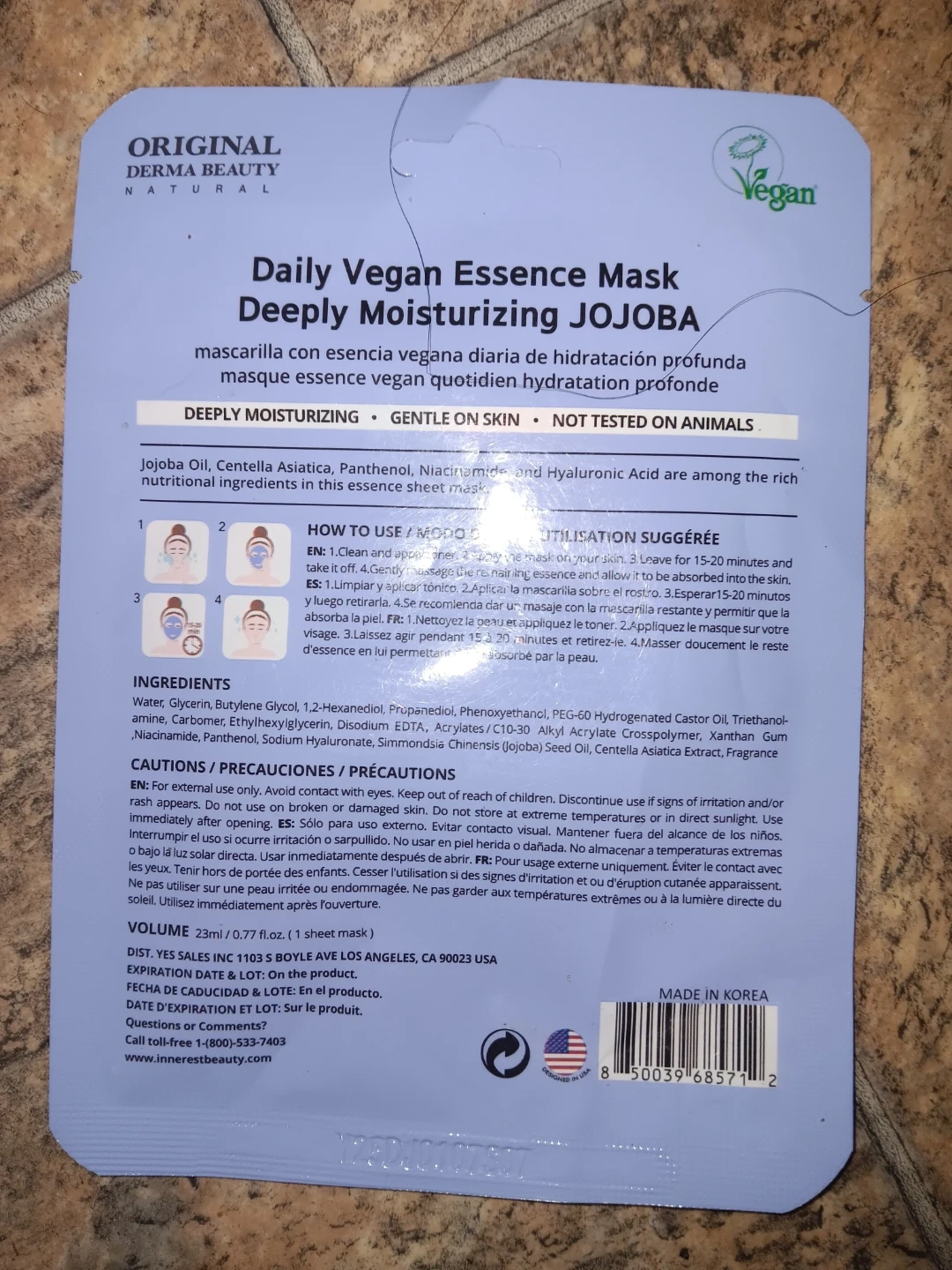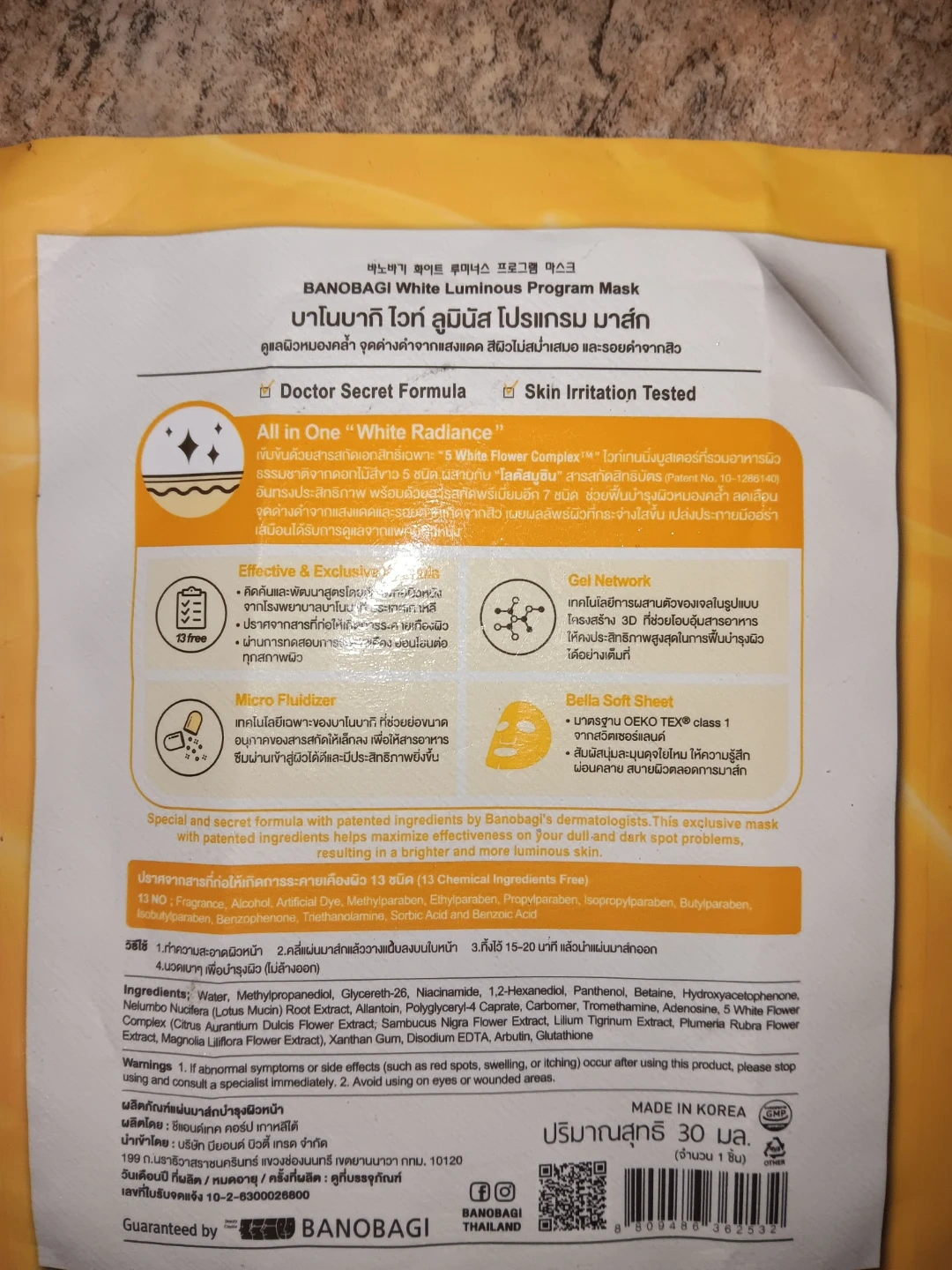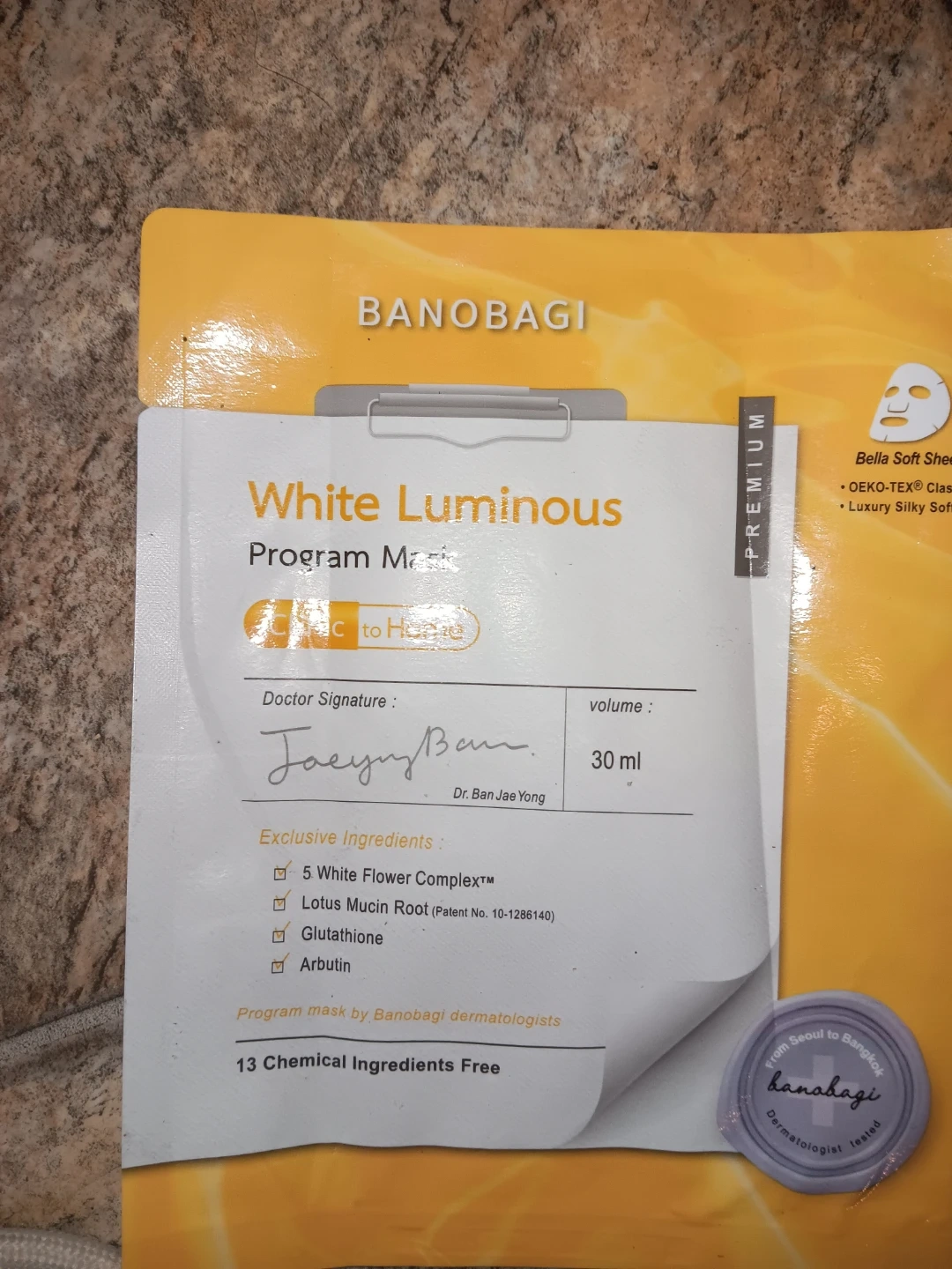 Two single-use facial sheet masks. The Banobagi mask is 30 ml and features a White Flower Complex, Glutathione, and Arbutin. The Derma Beauty mask is 23 ml with Jojoba Oil, Panthenol, Niacinamide, and Hyaluronic Acid. Both are designed for skin hydration and radiance.