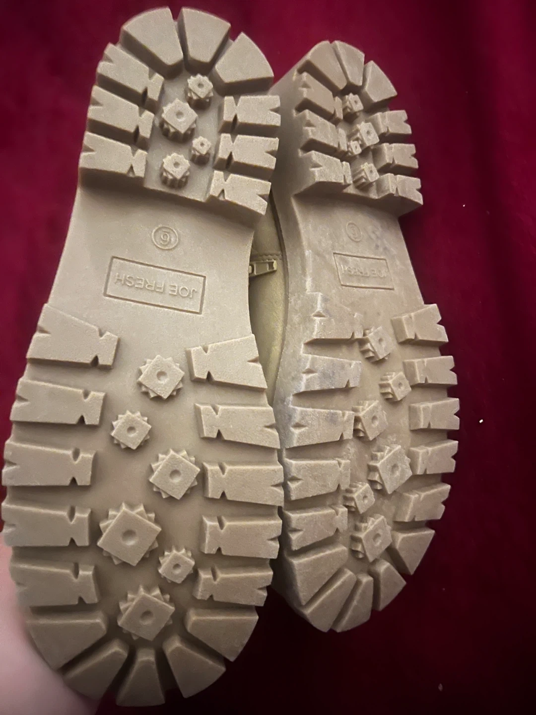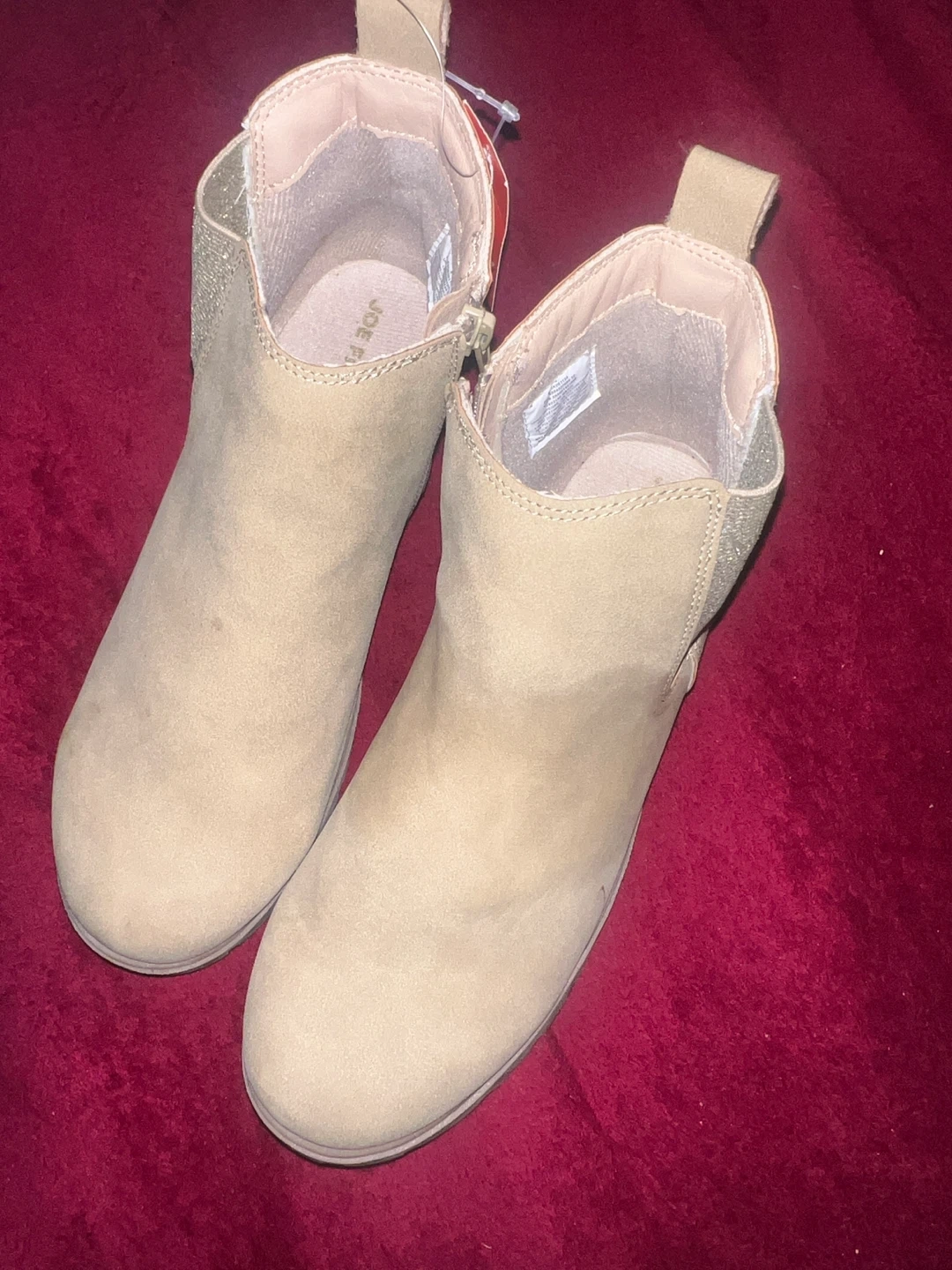 These Joe Fresh Chelsea boots feature a tan suede upper with elastic side panels for easy on and off. The lug sole provides good traction. They're made with a synthetic lining and outsole. Size is 6.
