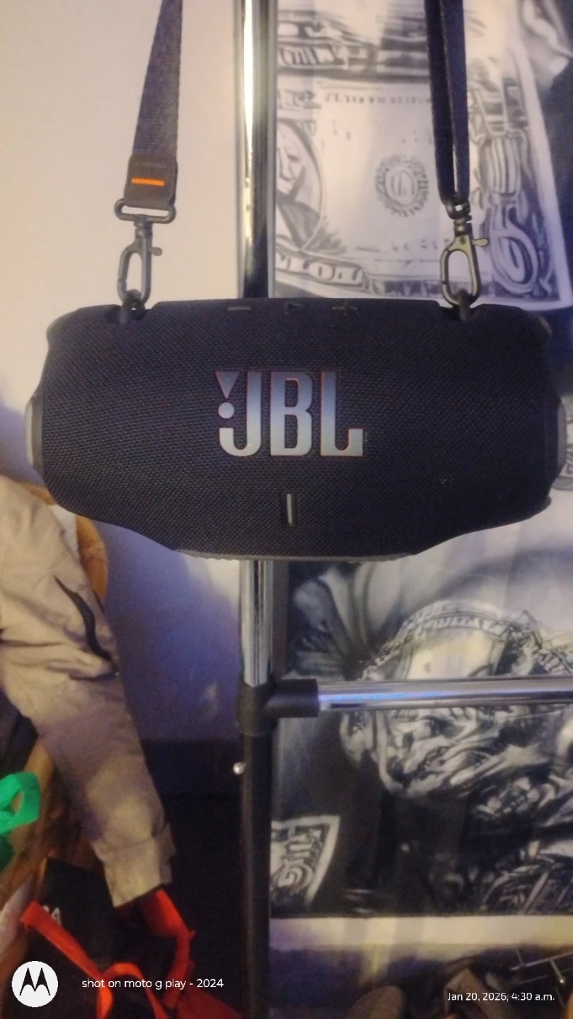 This is a black JBL Xtreme 3 portable speaker. It's waterproof and connects via Bluetooth. It's great for outdoor gatherings or everyday listening. Comes with a carrying strap.