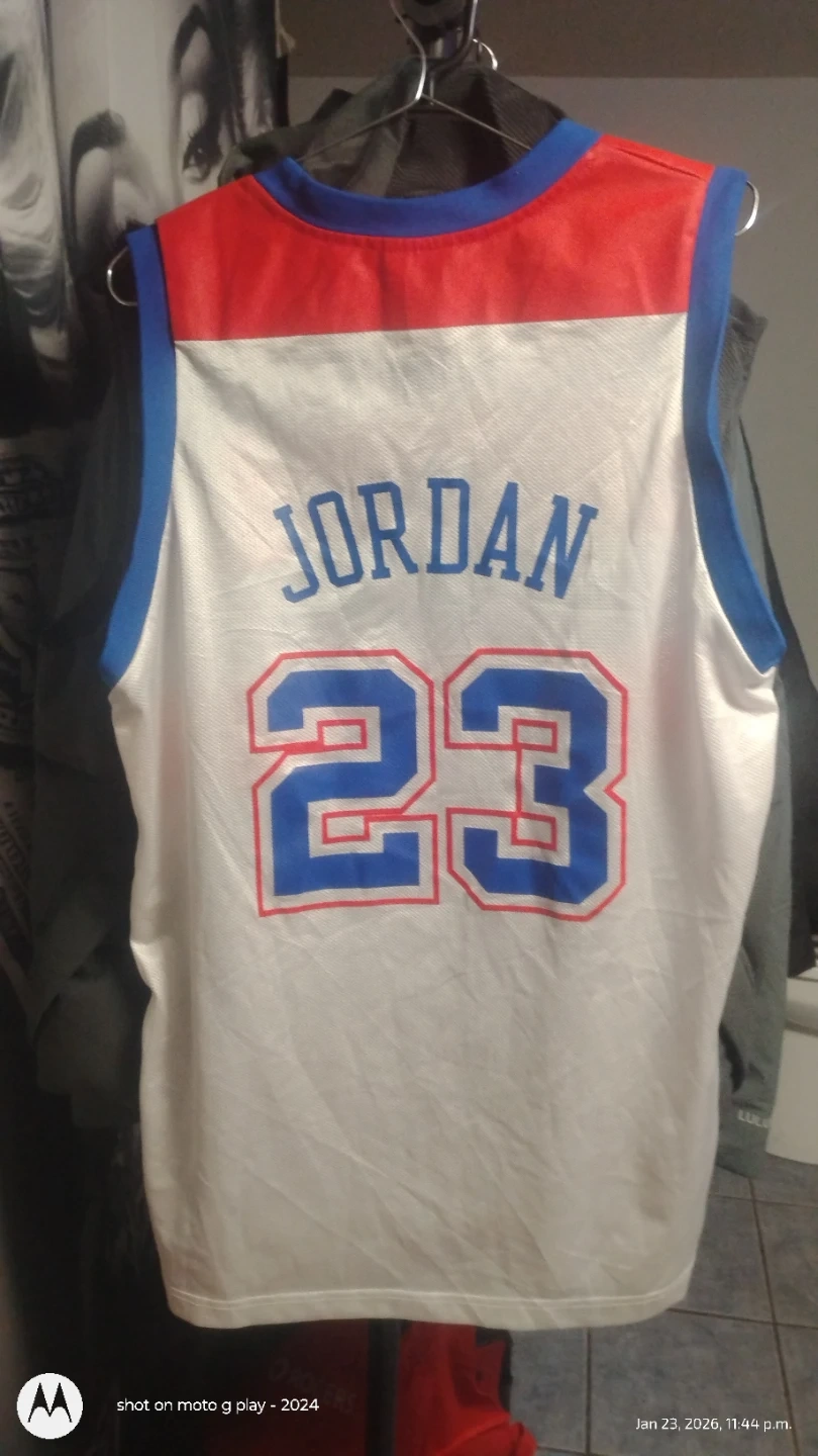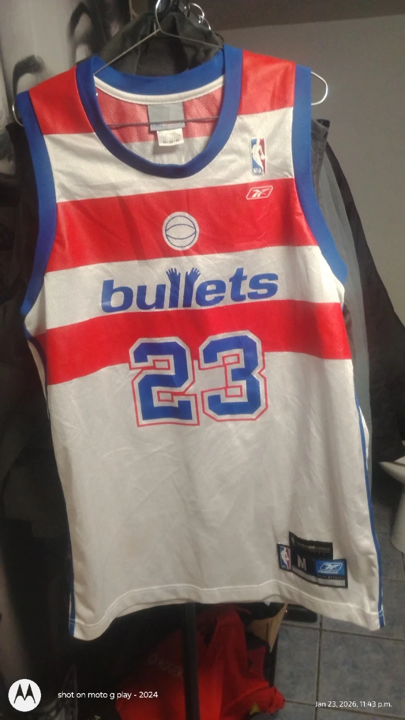 Get this classic Reebok Michael Jordan jersey! It features the Washington Wizards colours and his iconic number 23. This is a size Medium.