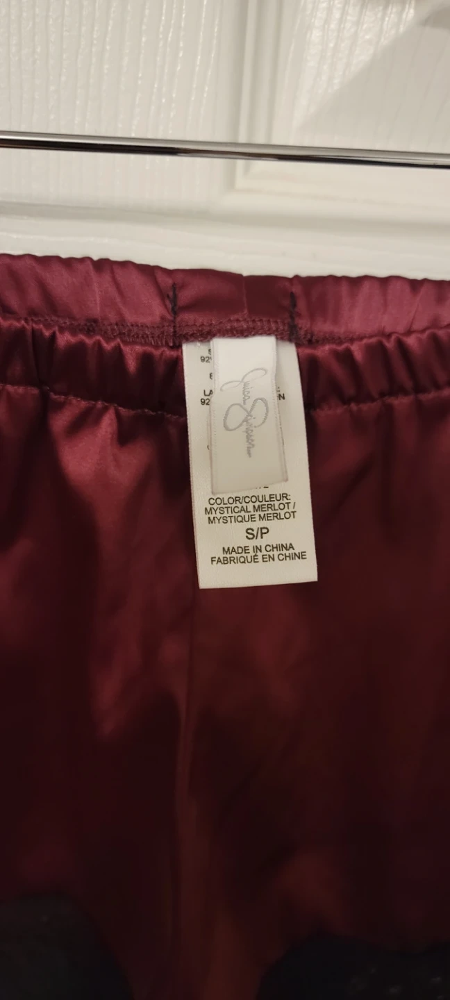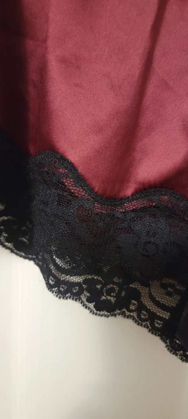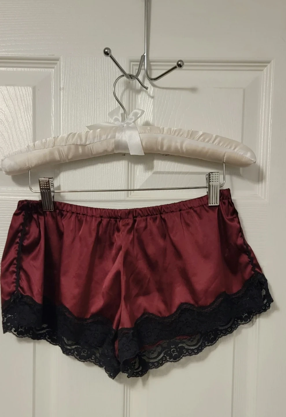 Gorgeous satin pajama shorts in a deep merlot colour. They feature delicate black lace trim and a small black bow. The waistband is elasticized for comfort. Size S/P.