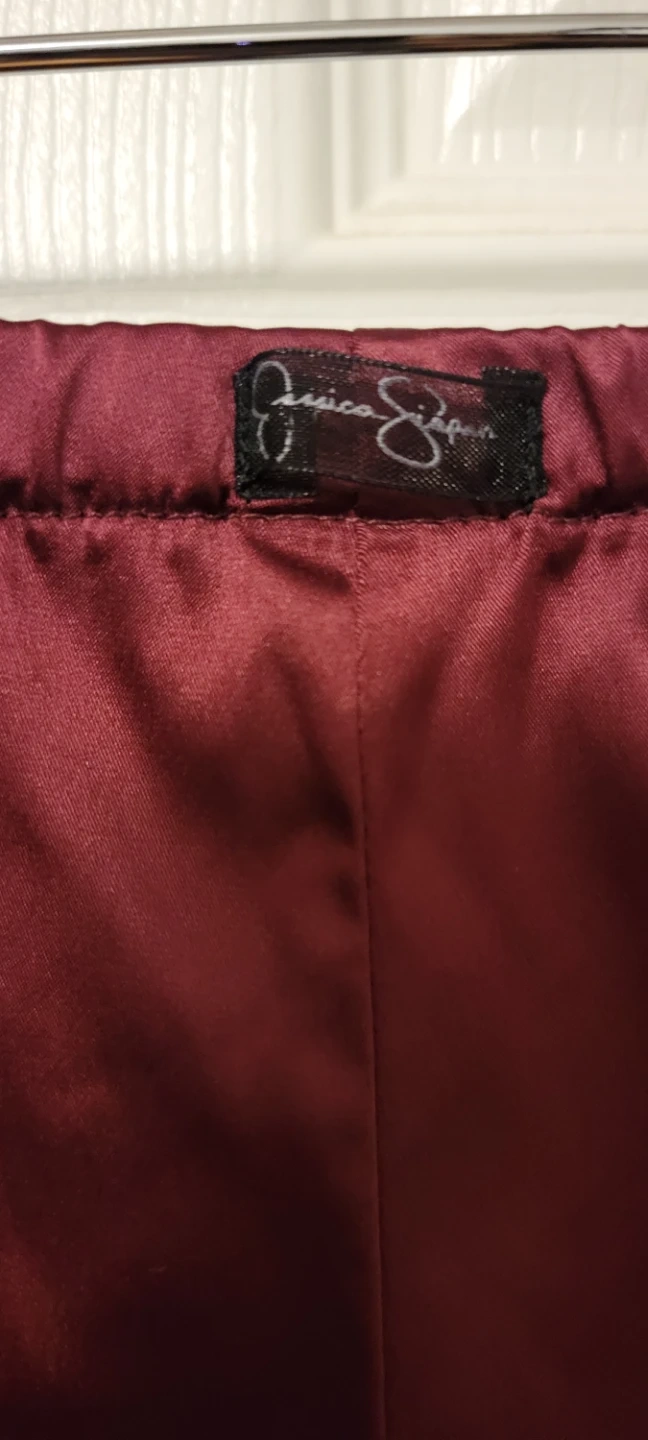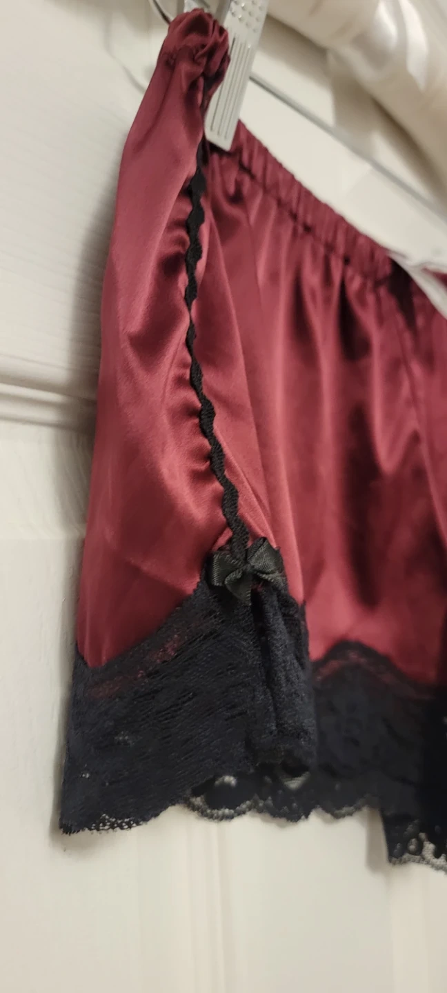 Gorgeous satin pajama shorts in a deep merlot colour. They feature delicate black lace trim and a small black bow. The waistband is elasticized for comfort. Size S/P.