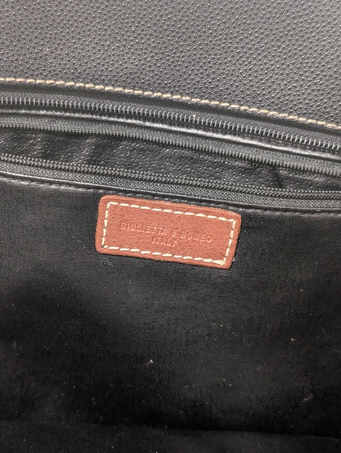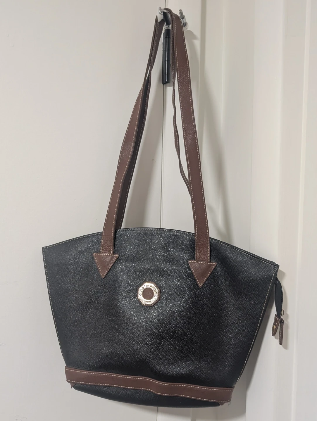 This Giulietta e Romeo tote bag is black with brown leather accents. It's made in Italy. The interior has a zippered pocket. Great for everyday use!