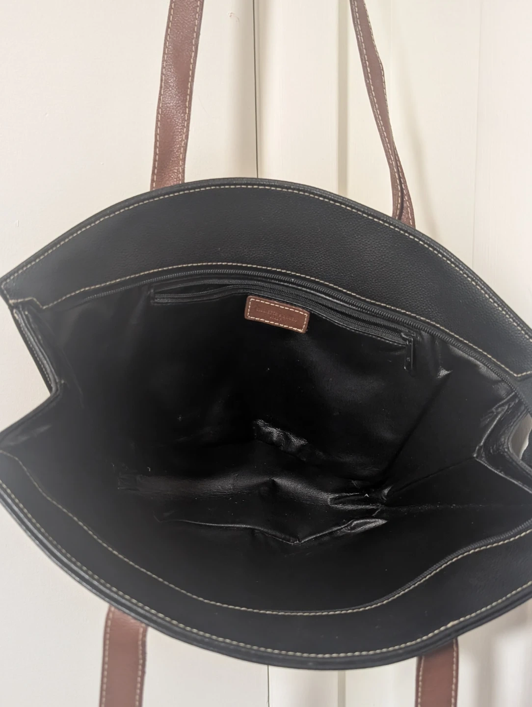 This Giulietta e Romeo tote bag is black with brown leather accents. It's made in Italy. The interior has a zippered pocket. Great for everyday use!