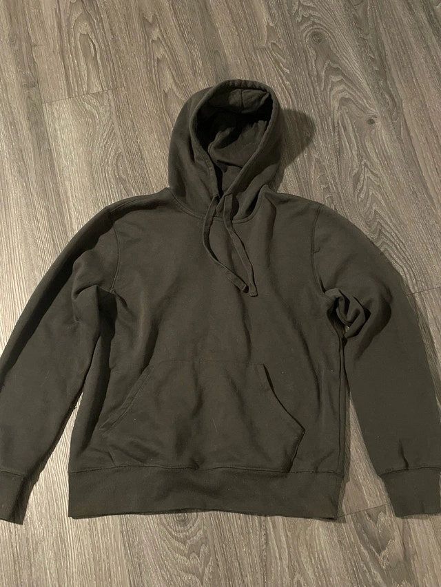 This is a soft, black hoodie in used condition. The hoodie is a size medium. Please review the images to see the condition of the hoodie. Size: Medium Colour: Black It's waiting for a new home and new adventures. If you see this ad, the hoodie is still available!