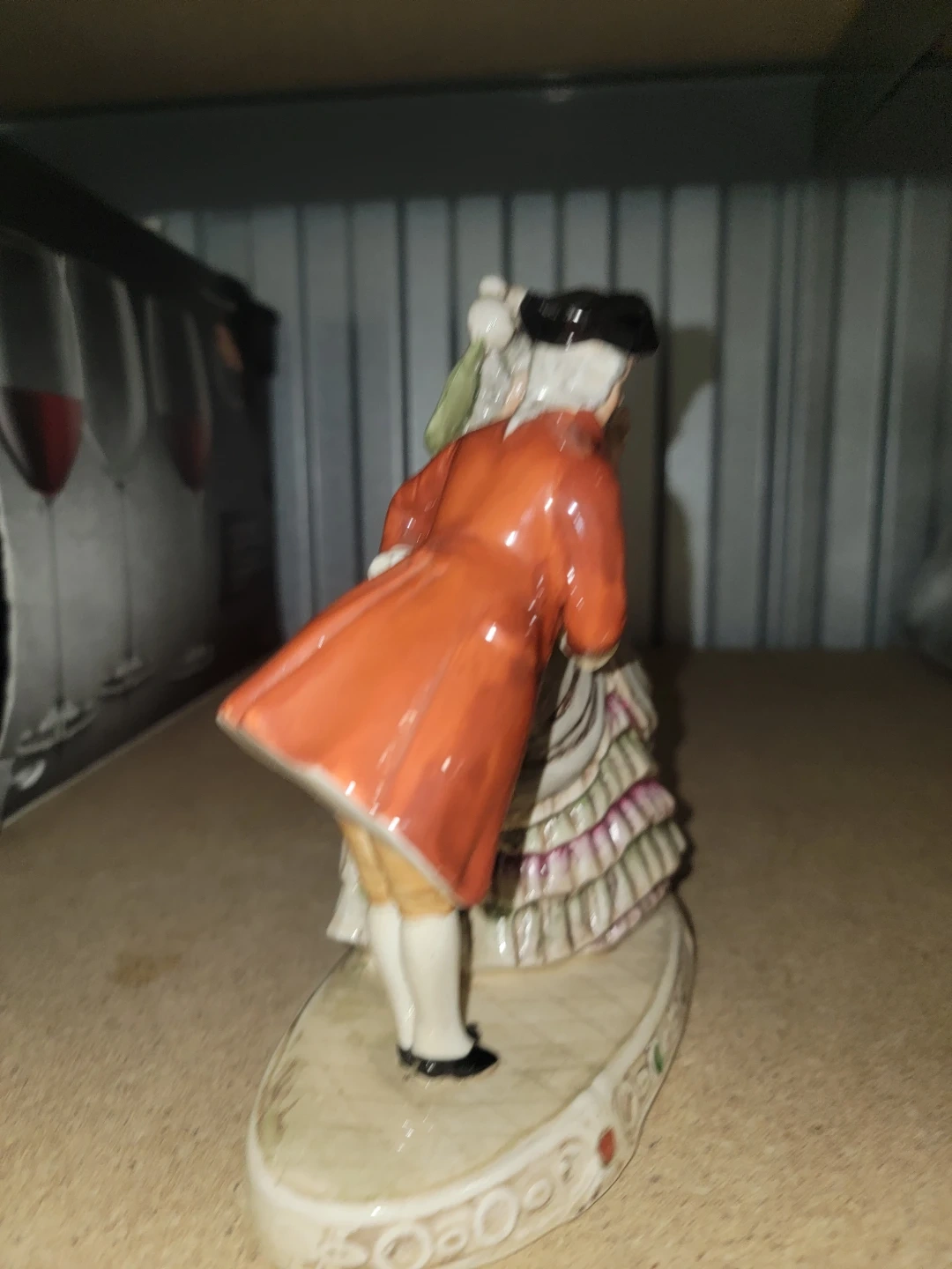 This is a decorative porcelain figurine featuring a couple . The detail on the clothing and base is quite intricate. It's a lovely piece for display.