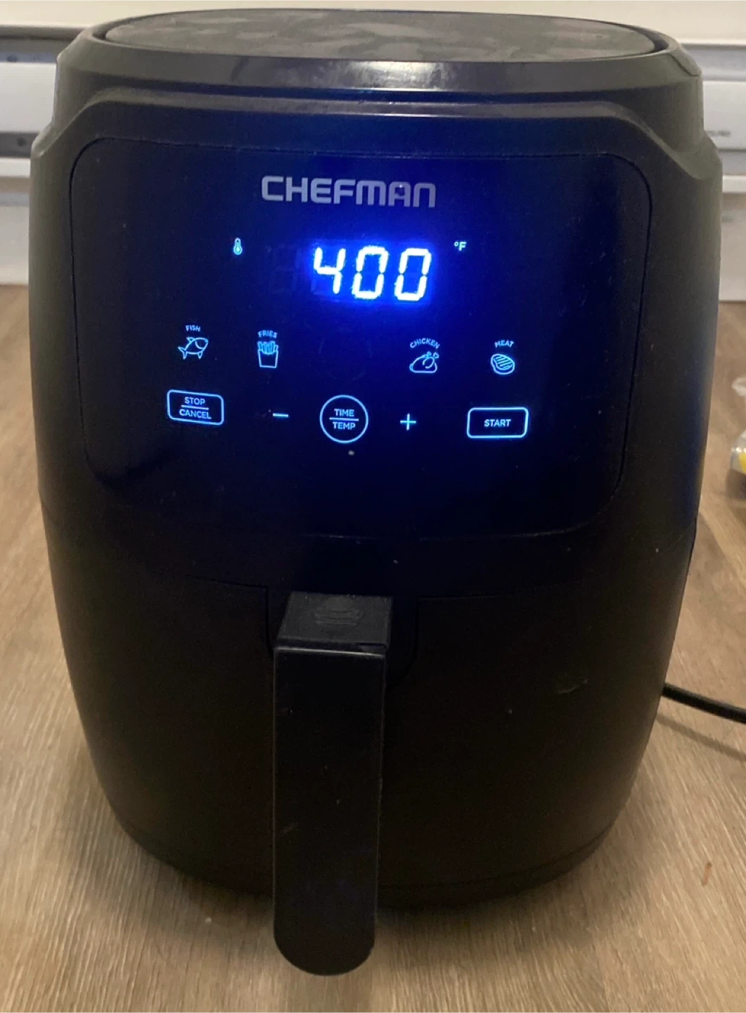 This is a black Chefman air fryer. It has a digital display with preset icons for fish, fries, chicken, and meat. You can adjust the time and temperature to cook your food. It's simple to use!