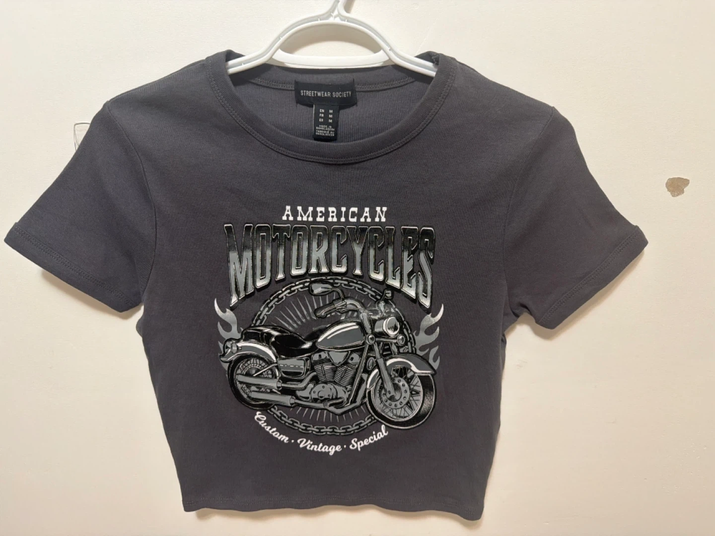 This Streetwear Society t-shirt features a cool 'American Motorcycles' graphic on the front. It's made of 100% cotton for comfort. Size medium. Manufactured in Bangladesh.