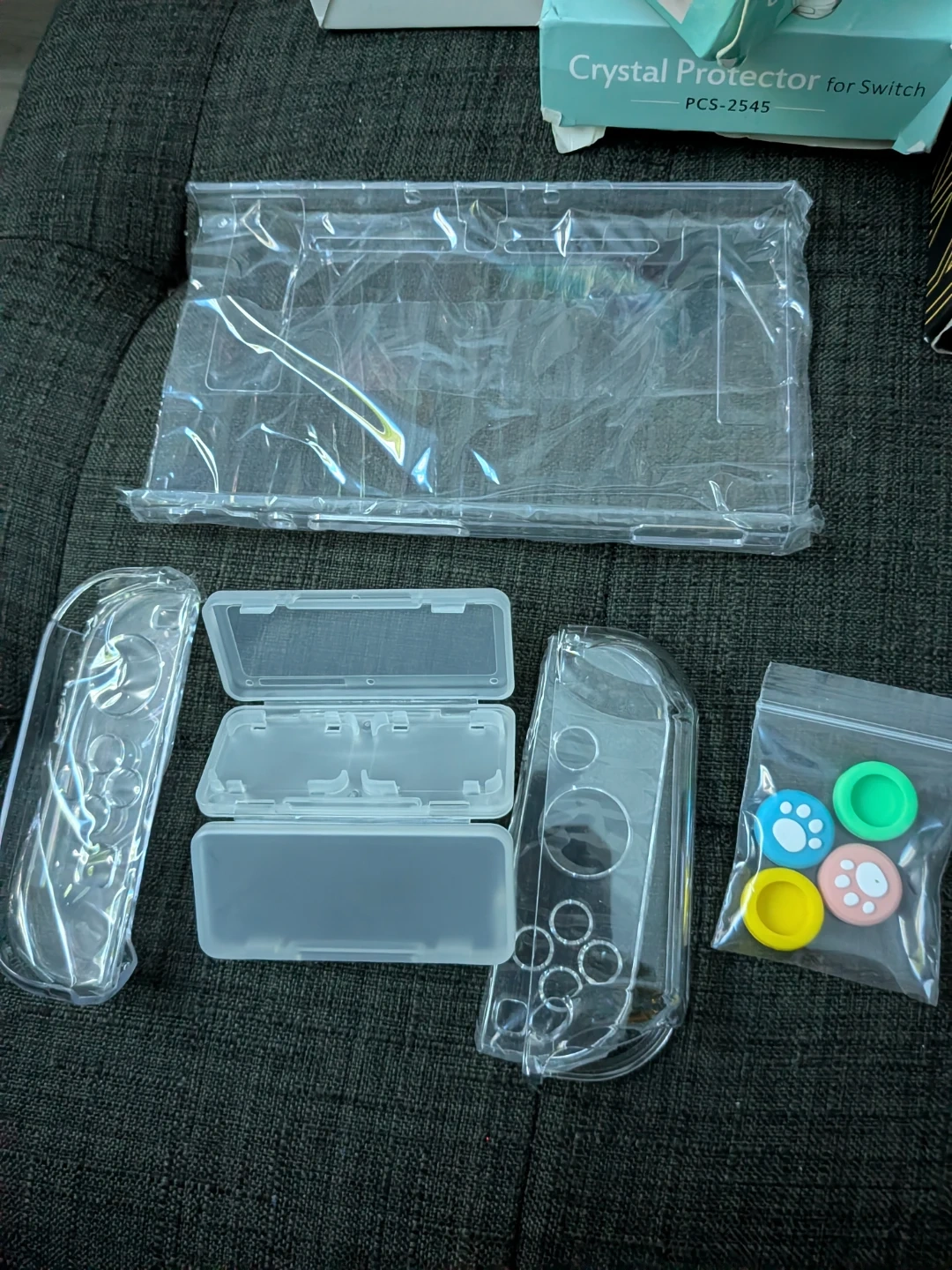 This crystal protector is designed for the Nintendo Switch. It includes the main body protector, a case for the Joy-Cons, and four colorful joystick caps. Made from high-quality, clear material for better protection. It's a clear protector for your Nintendo Switch console.