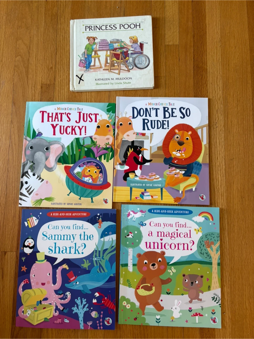 This bundle includes five fun children's books perfect for young readers. Titles are 'Princess Pooh', 'That's Just Yucky!', 'Don't Be So Rude!', 'Can you find... Sammy the Shark?', and 'Can you find... a magical unicorn?'. Great for story time!