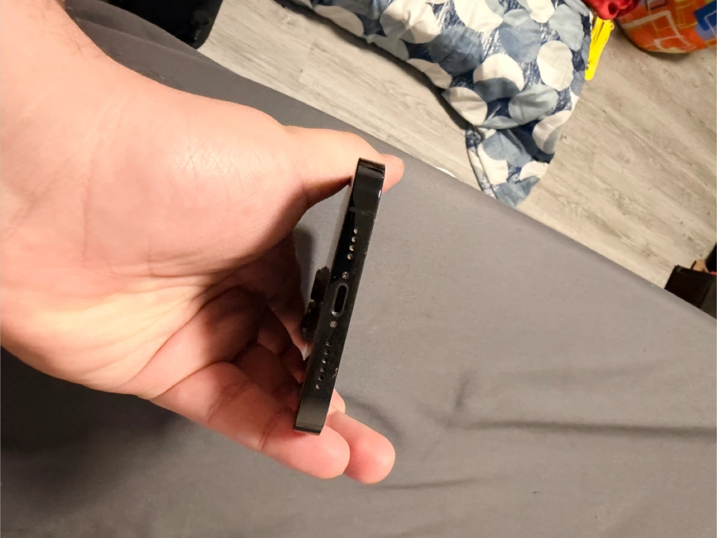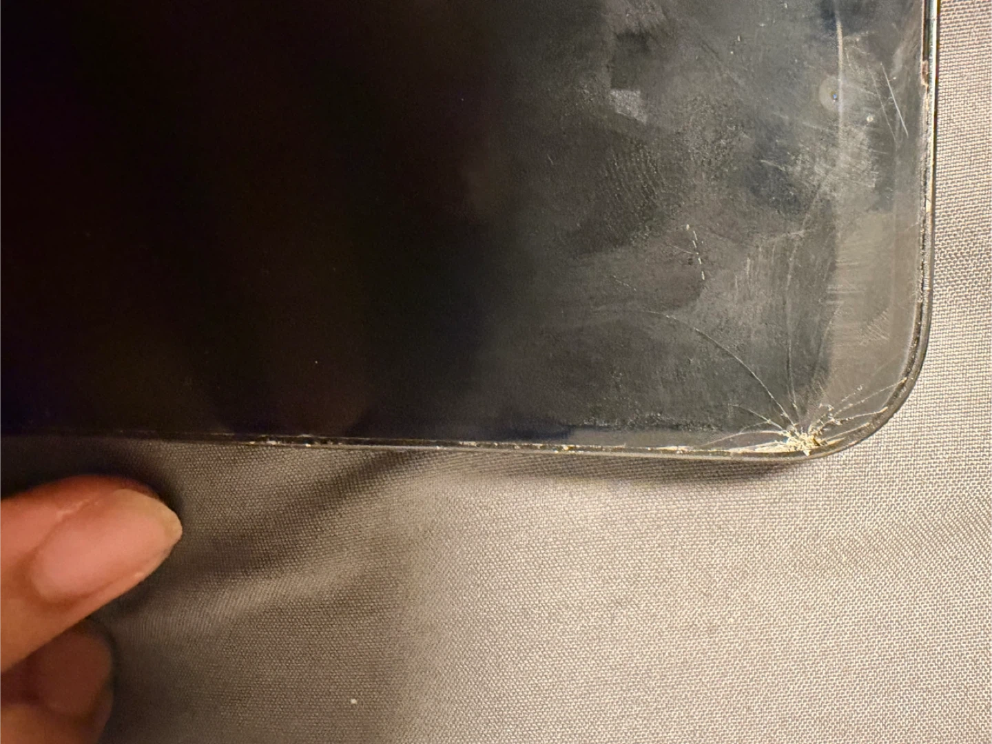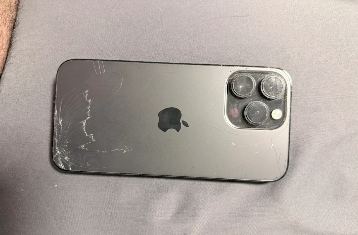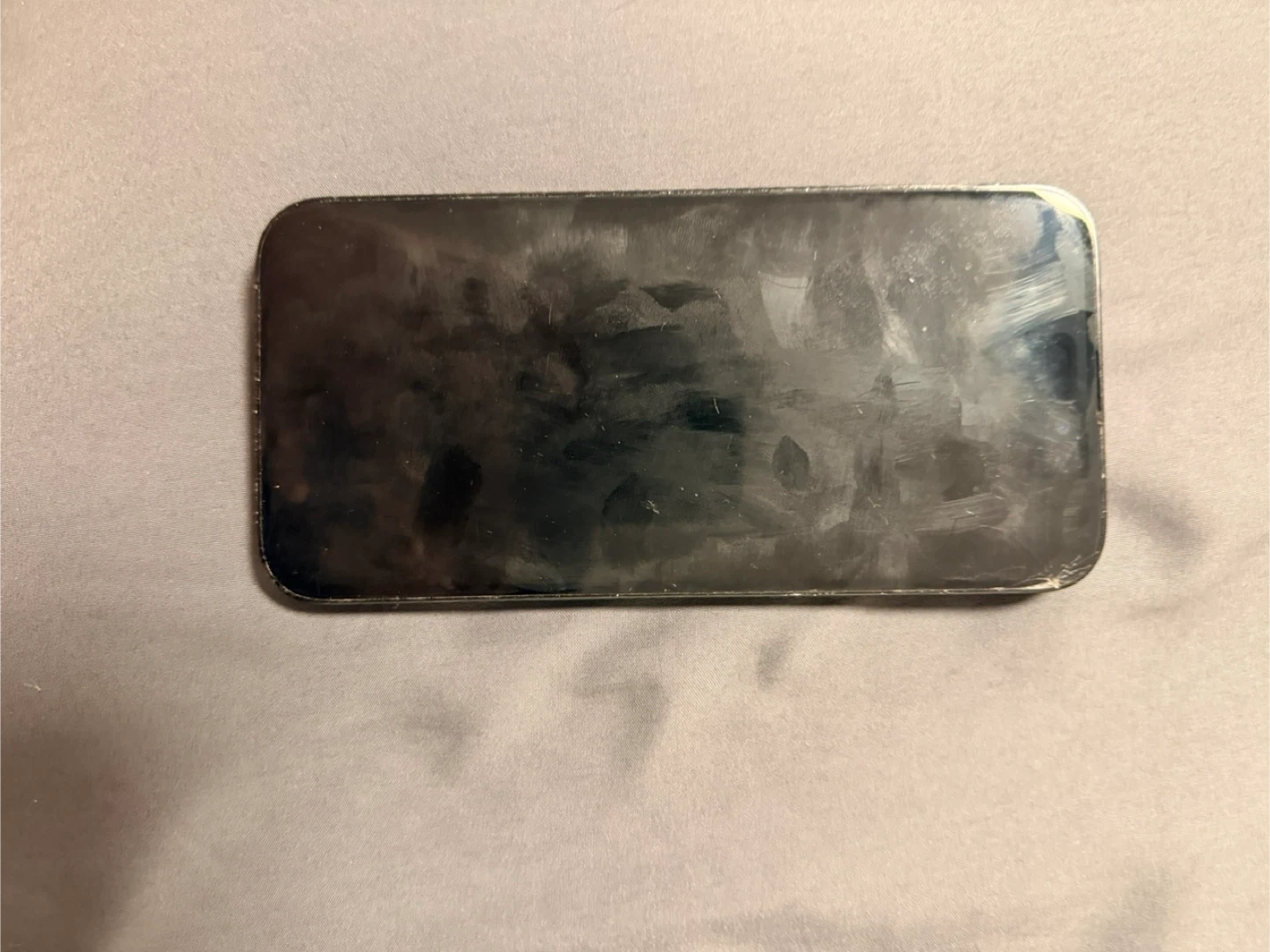 This is an Apple iPhone 14 Pro Max in Deep Purple. The back glass is cracked, and there are scratches on the front screen. Phone works grate 79% battery Heath we can talk about the price