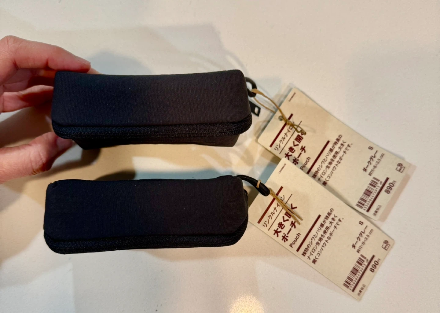Two black MUJI nylon pouches included. These pouches are size S, measuring 11-15.5 cm. They're great for organizing smaller items.