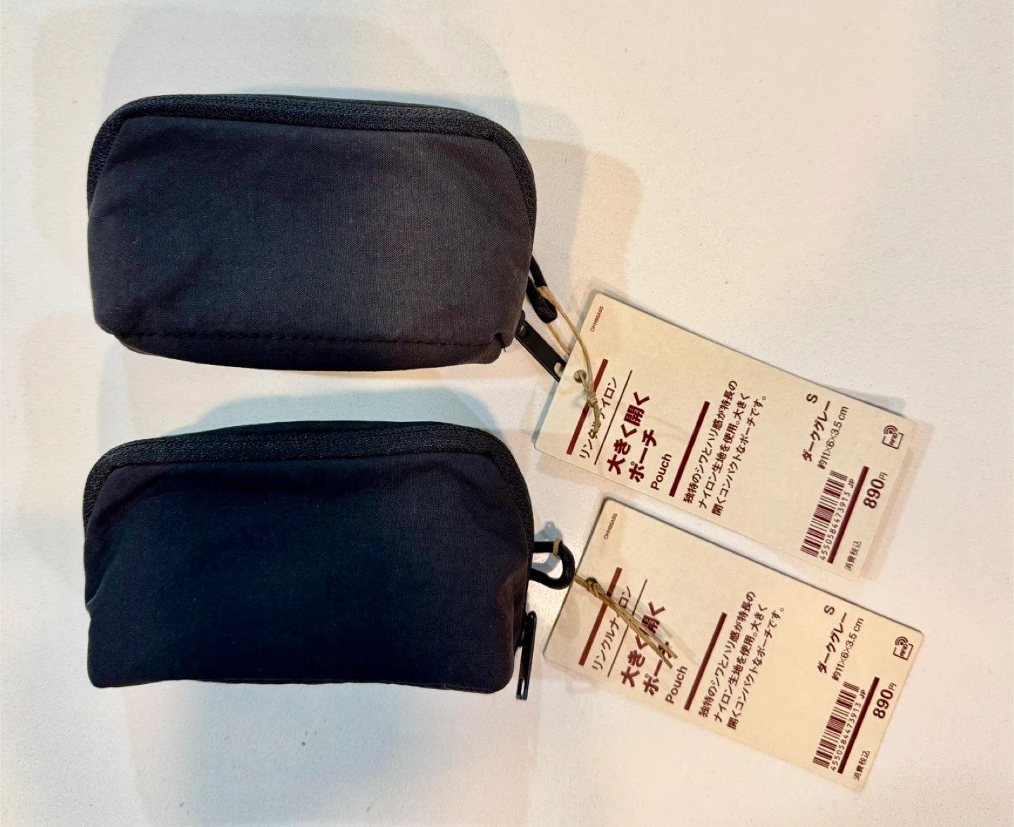 Two black MUJI nylon pouches included. These pouches are size S, measuring 11-15.5 cm. They're great for organizing smaller items.