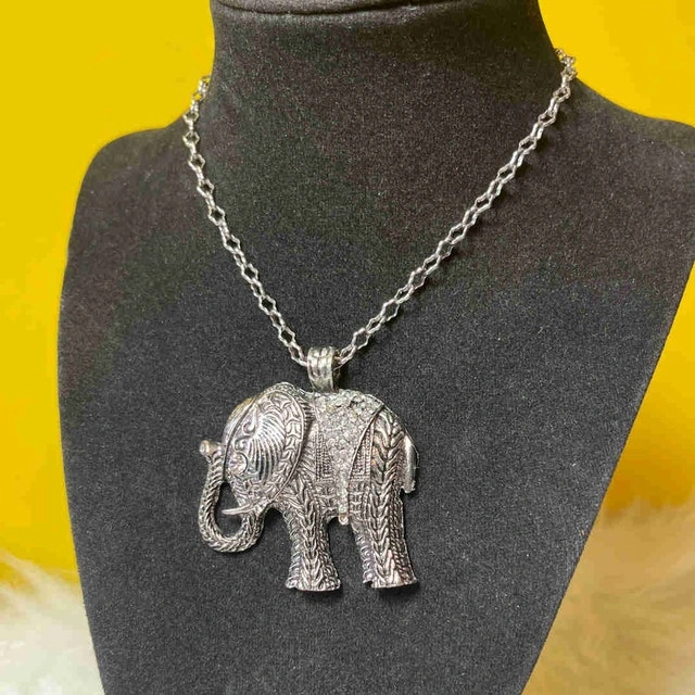 This is a used elephant necklace with a beautiful silver chain. The pendant is a detailed elephant figure, perfect for animal lovers! It's in good condition, ready to add a touch of whimsy to your outfit. This piece is looking for a new home, and if you're seeing this ad, it means it's still available!
