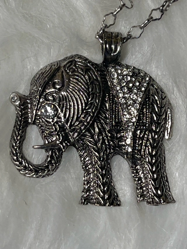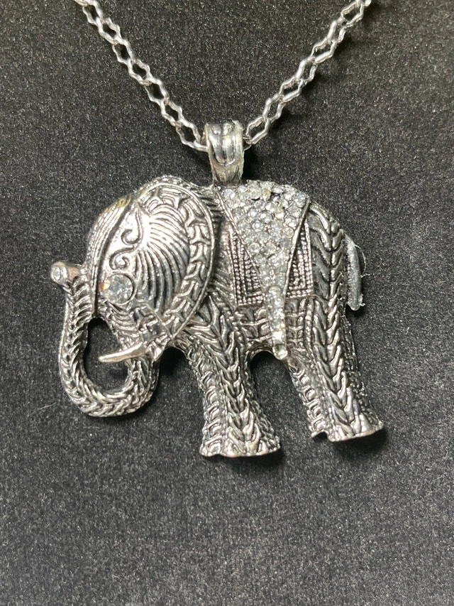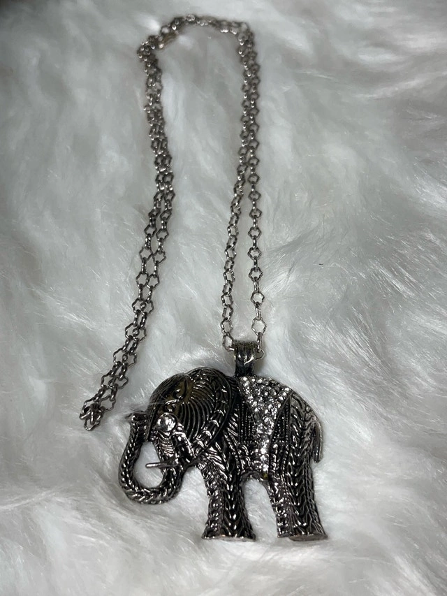 This is a used elephant necklace with a beautiful silver chain. The pendant is a detailed elephant figure, perfect for animal lovers! It's in good condition, ready to add a touch of whimsy to your outfit. This piece is looking for a new home, and if you're seeing this ad, it means it's still available!