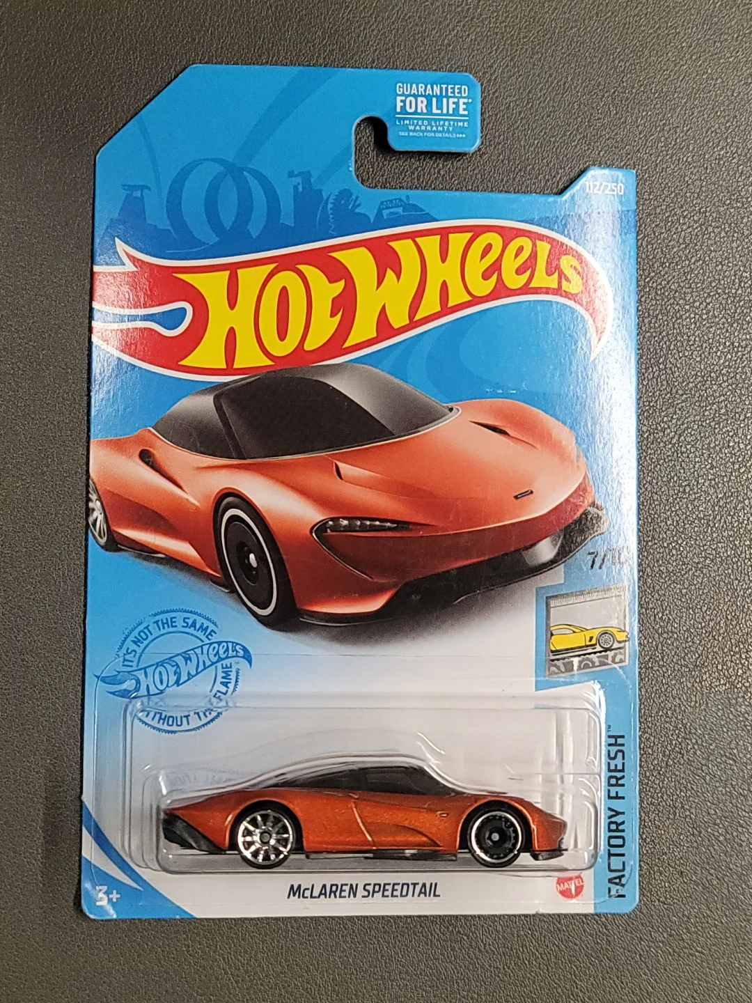 This is a Hot Wheels McLaren Speedtail toy car. It's an orange die-cast model in its original packaging. This collectible is rated for ages 3 and up.