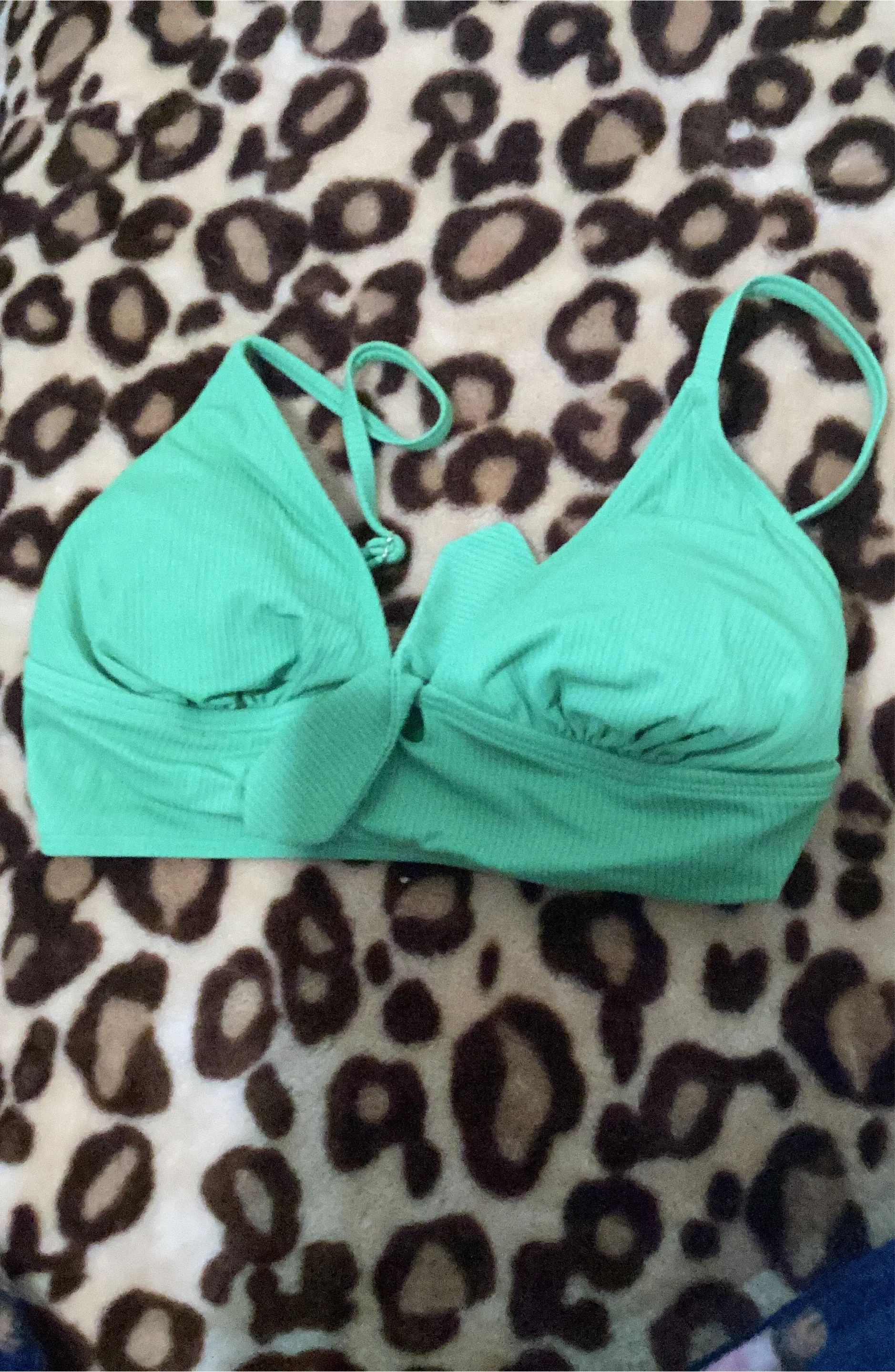 This is a comfortable green ribbed bathing suits top bralette. It's made from a soft, stretchy fabric. It features adjustable straps for a custom fit. Perfect for casual wear or layering!