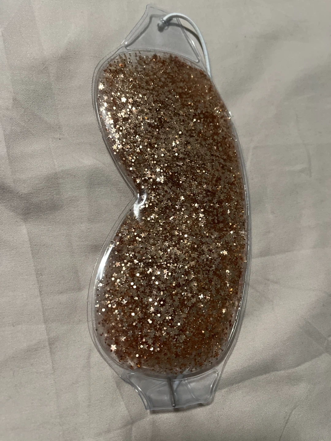 This eye mask is filled with glitter gel. It has an elastic strap for a comfortable fit. It's great for relaxing and cooling the eyes.