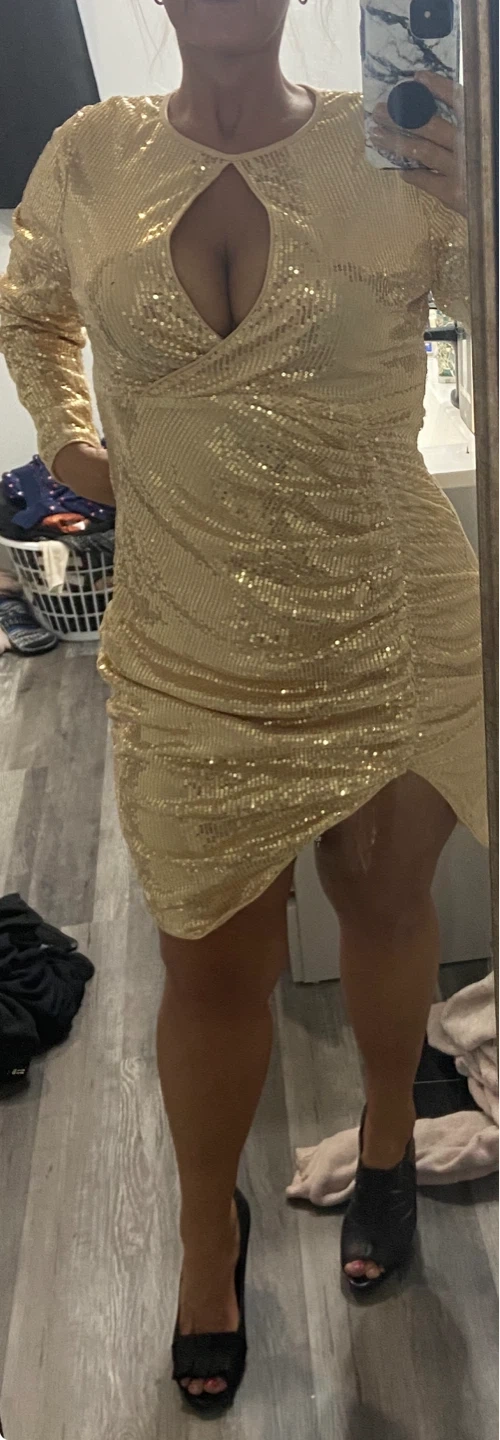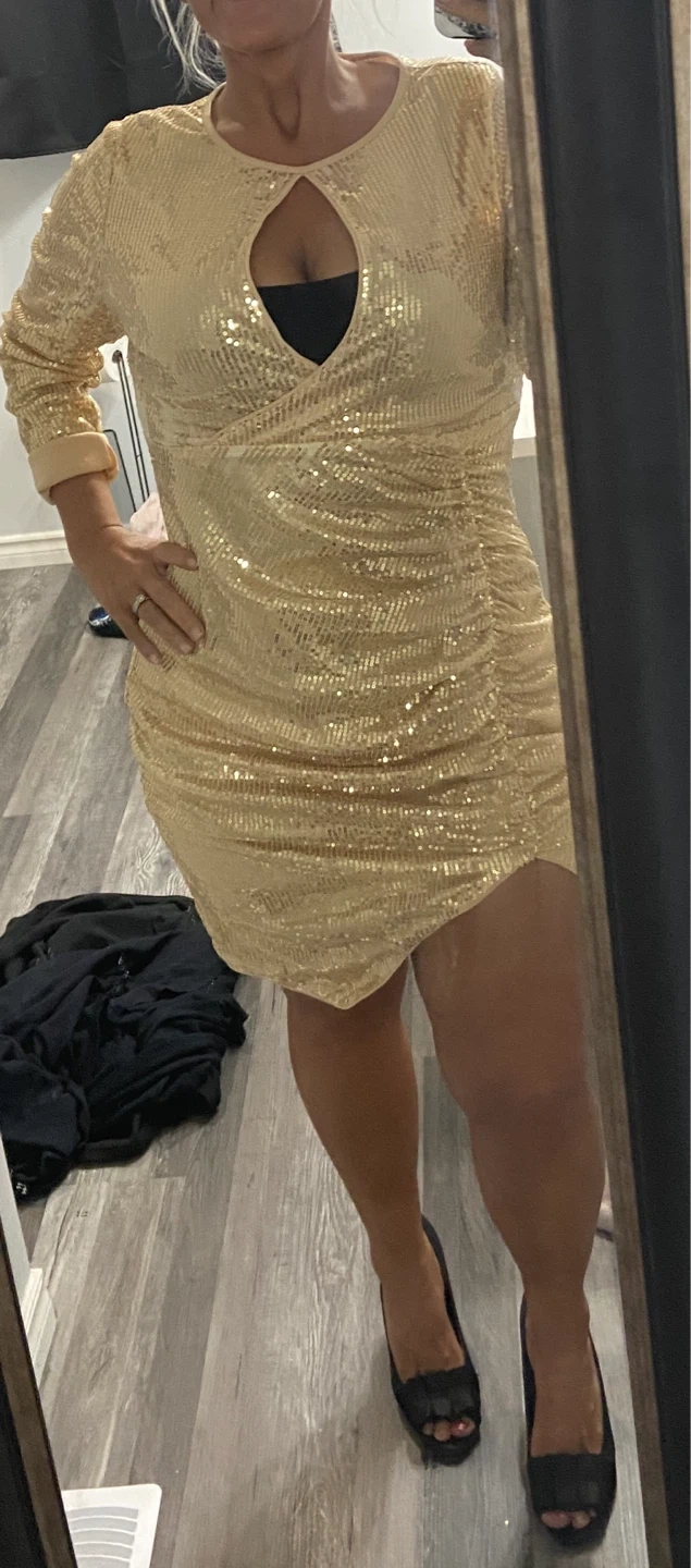 Sparkly gold sequin dress with long sleeves and a flattering ruched design. It features a stylish cutout at the neckline. Perfect for a night out or special occasion!