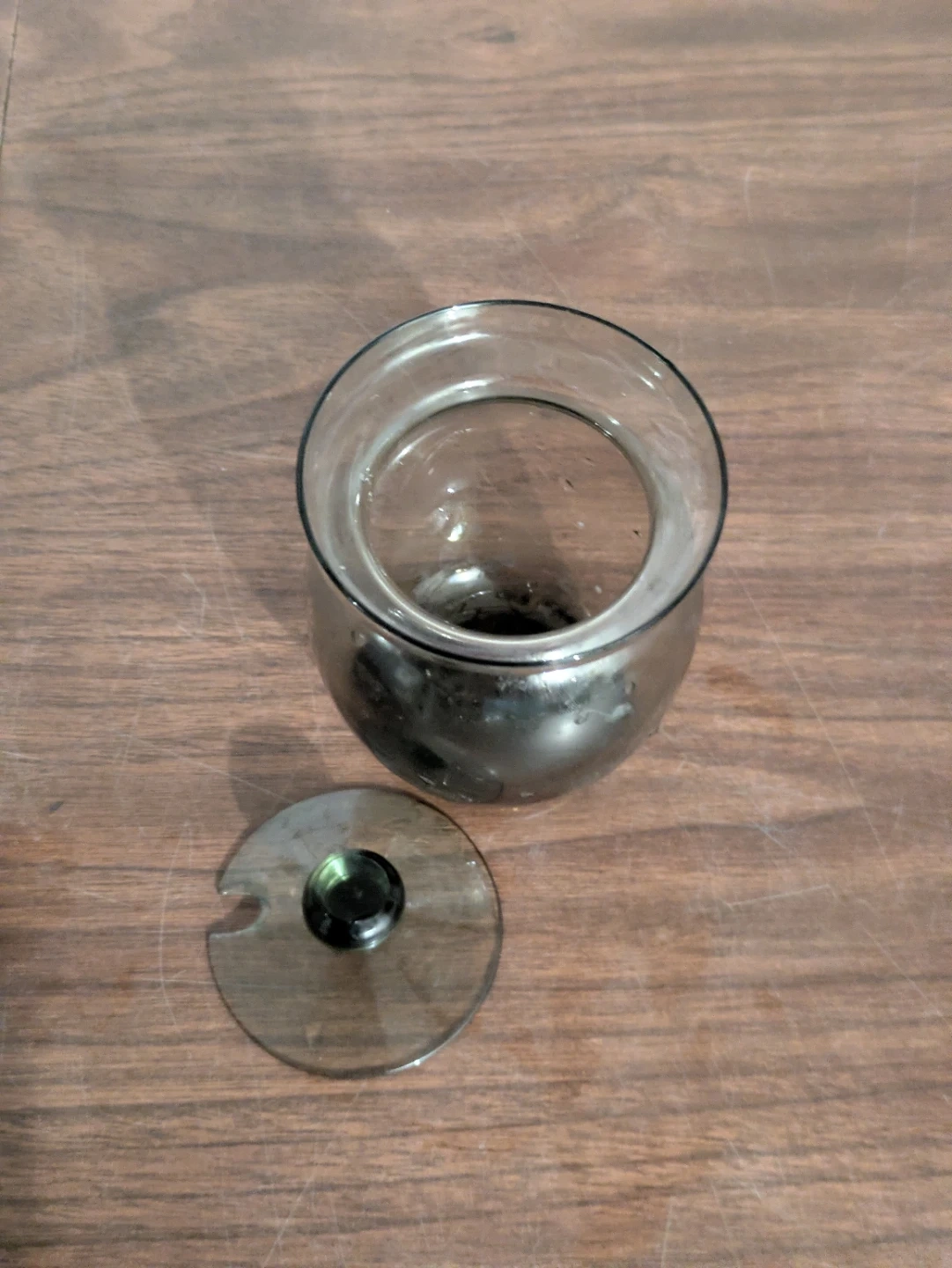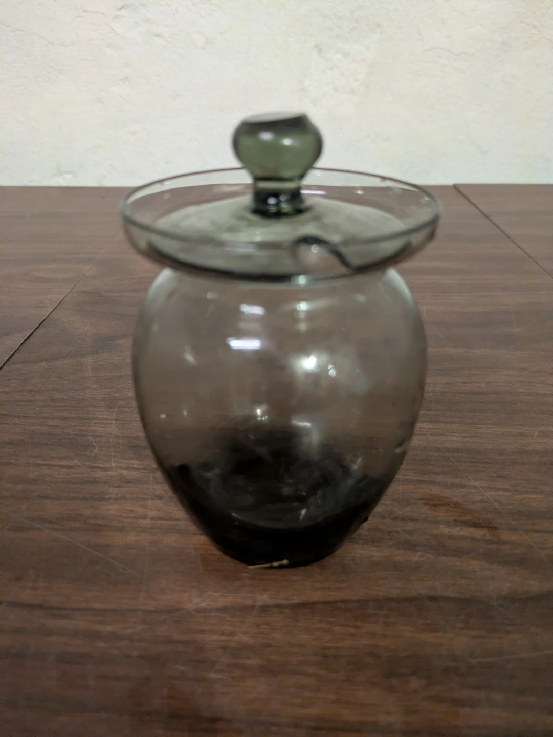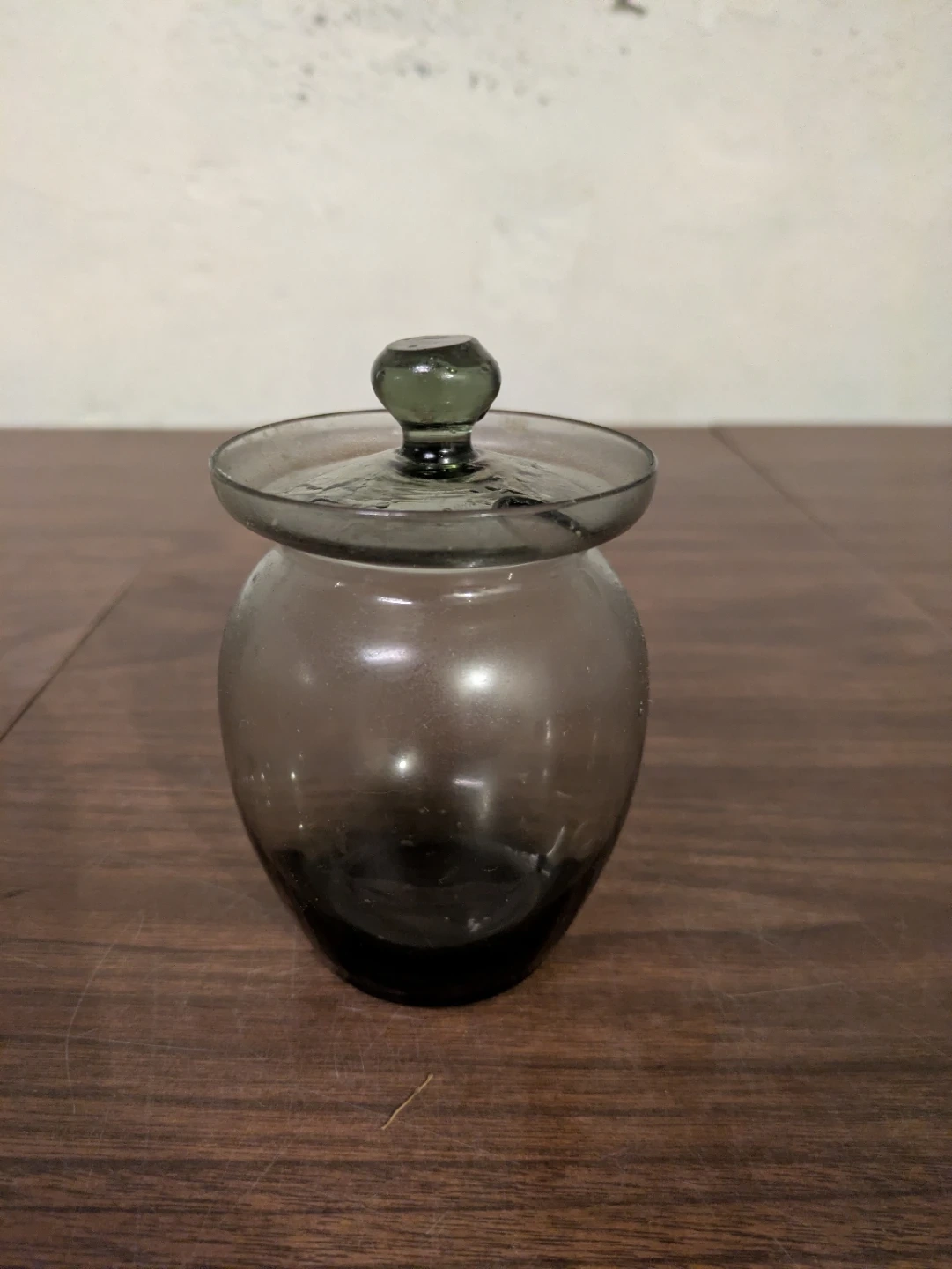 This is a small glass jar with a lid, perfect for storing jams or other small items. The glass is a smoky grey colour and it's nice and sturdy. It has a small spoon slot in the lid. It's a handy little container!