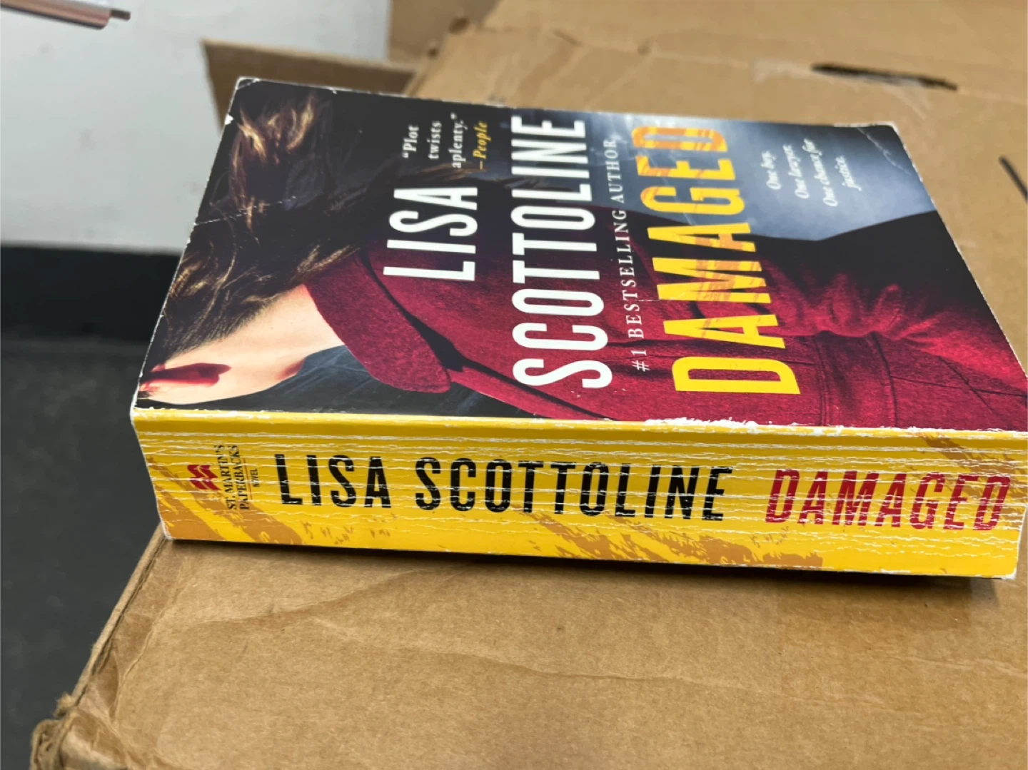 This is a paperback copy of "Damaged" by Lisa Scottoline. It's a thriller novel about a young boy, a lawyer, and justice. The book features a plot with twists and turns.