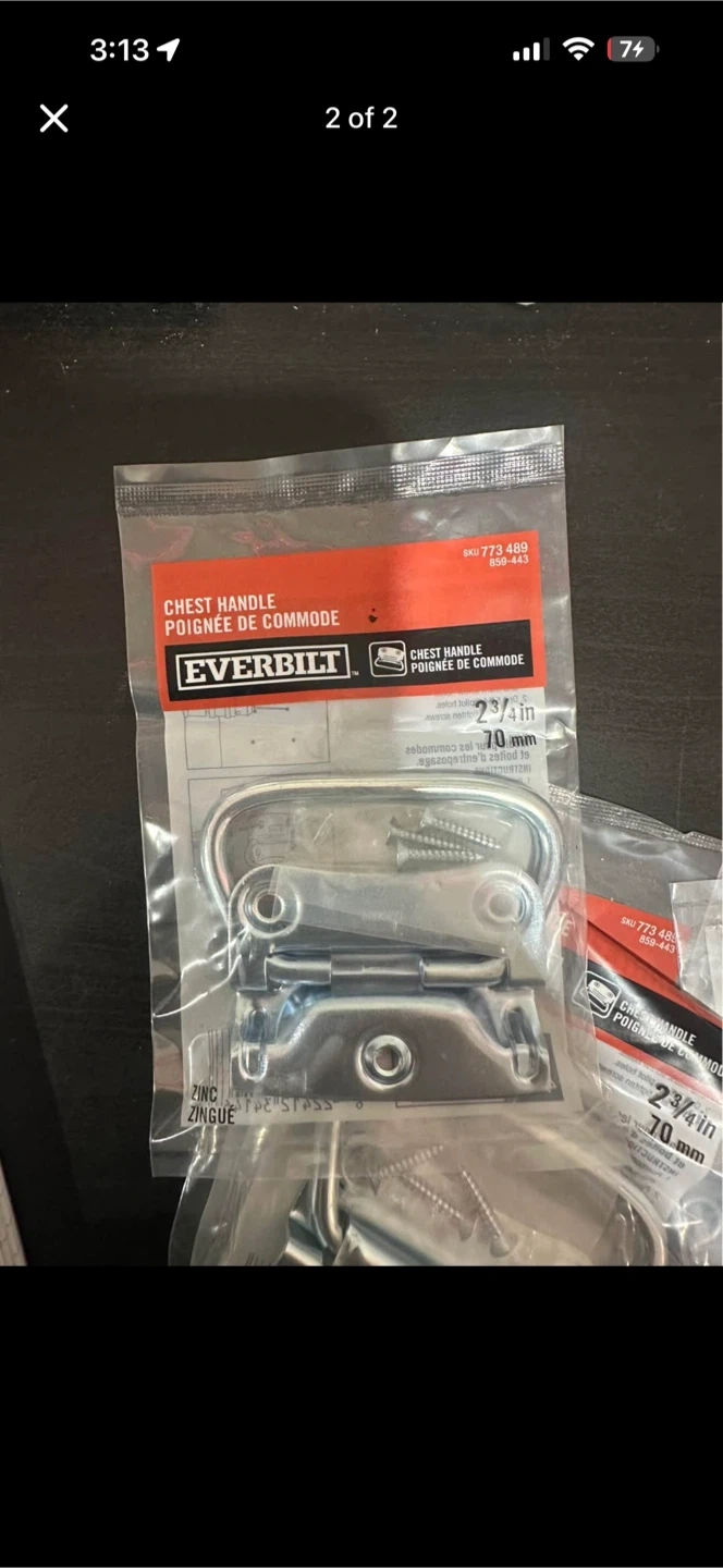 This is an EVERBILT chest handle, measuring 2 3/4 inches. It's made of zinc and comes with screws. These handles are useful for opening chests and other storage containers.