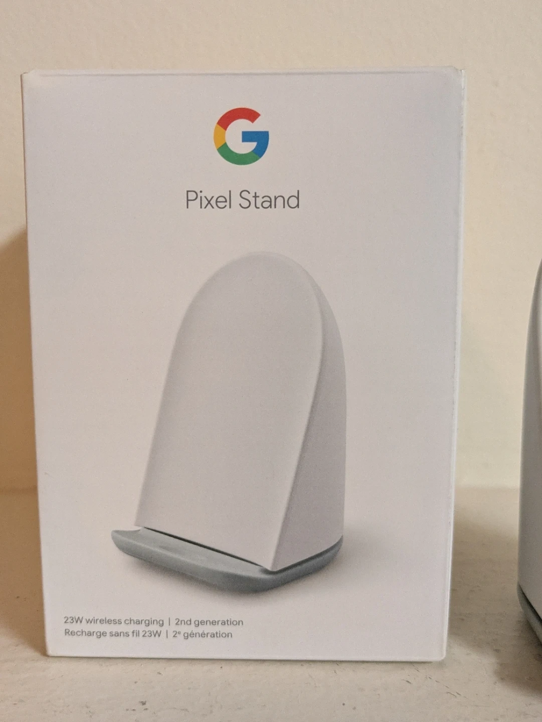 This is the Google Pixel Stand, 2nd generation. It offers 23W wireless charging. This stand is great for quickly charging your compatible devices.