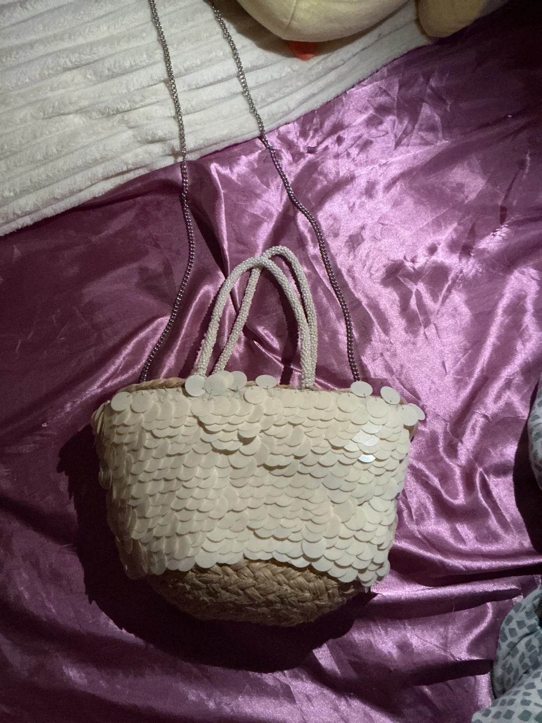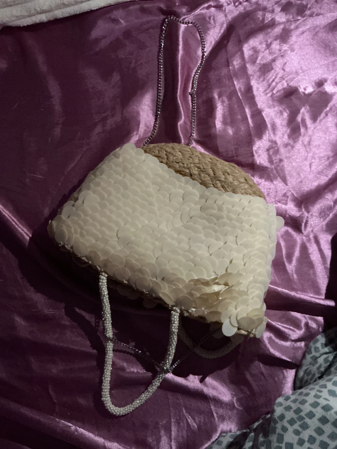 This cute bucket bag features a straw base with a creamy white sequin-covered body. It has beaded top handles and a silver chain strap. Perfect for everyone, thank you bye