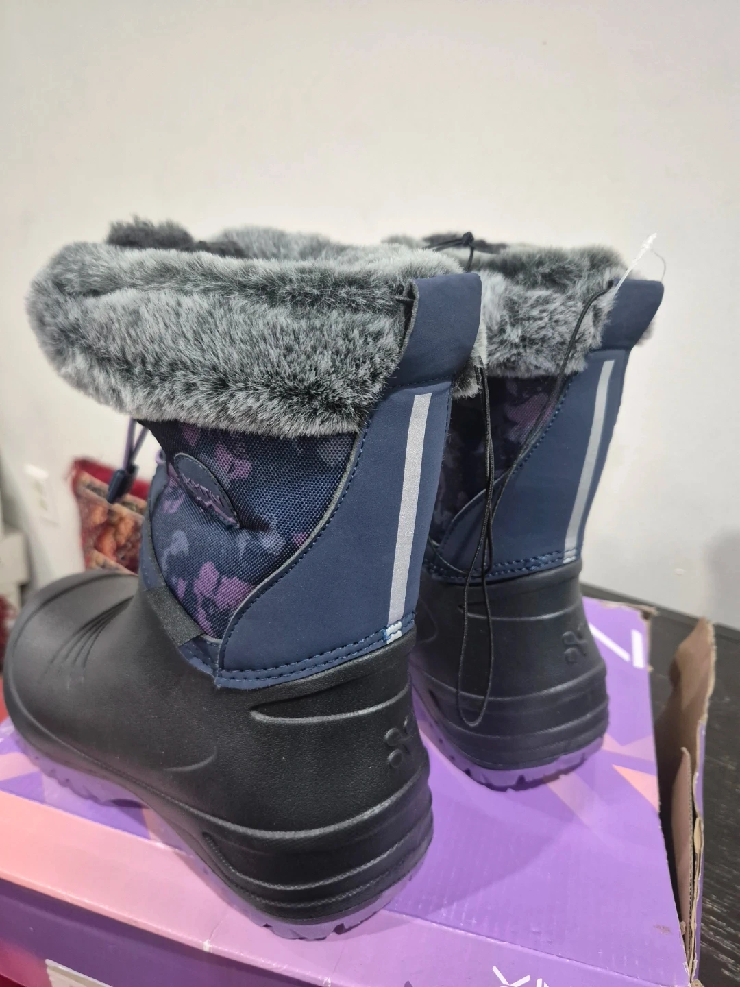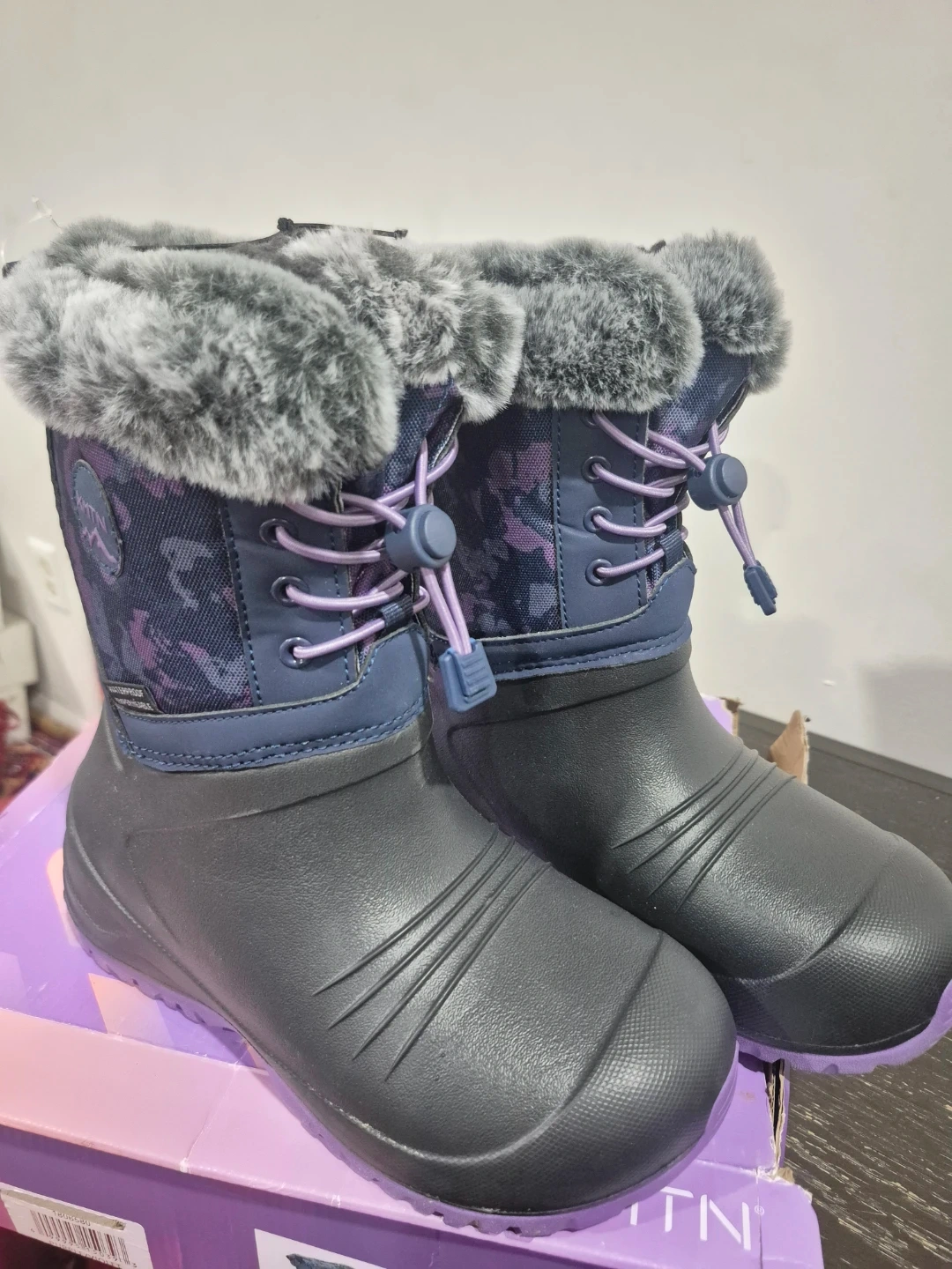 These XMTN winter boots are waterproof and feature a fuzzy lining for warmth. They have a rubber sole and adjustable drawstring closure. Comes with original box the box is a bit damage.brand new