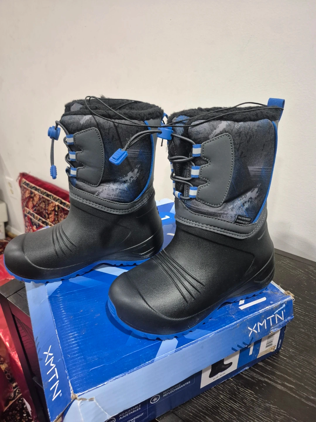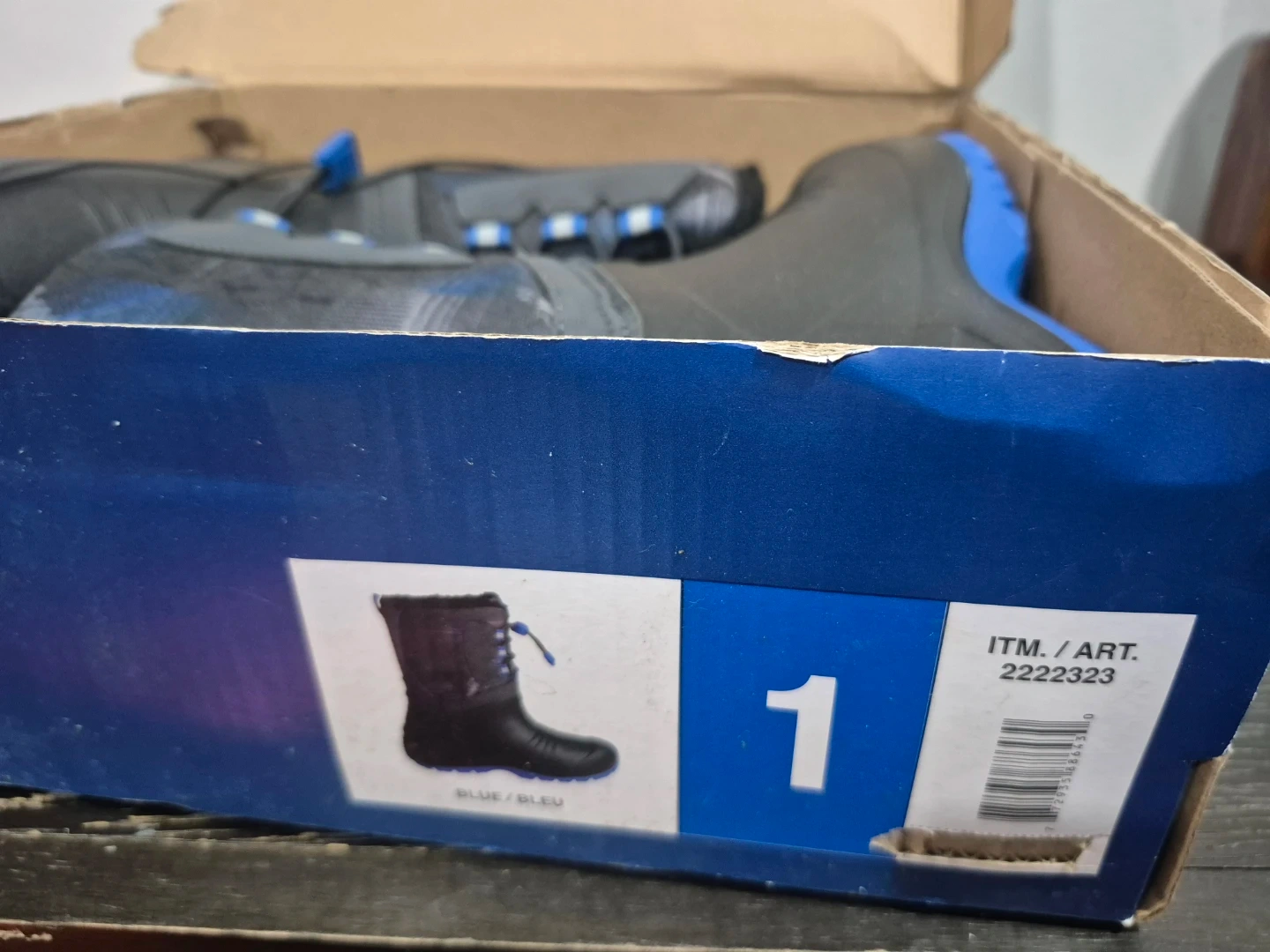 These kids' winter boots are waterproof and insulated for warmth. They feature a grey and blue camo pattern with a drawstring closure. Includes original box. Box a bit damage but brand new Boots.
