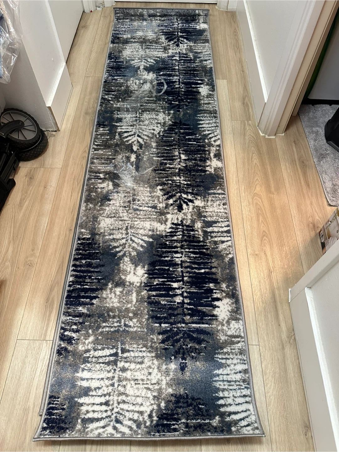 This is a navy runner rug from a2zrug's Paris Collection. It's made in Türkiye. The rug has a distressed leaf pattern. Its dimensions are 60x230cm / 2ftx7.5ft