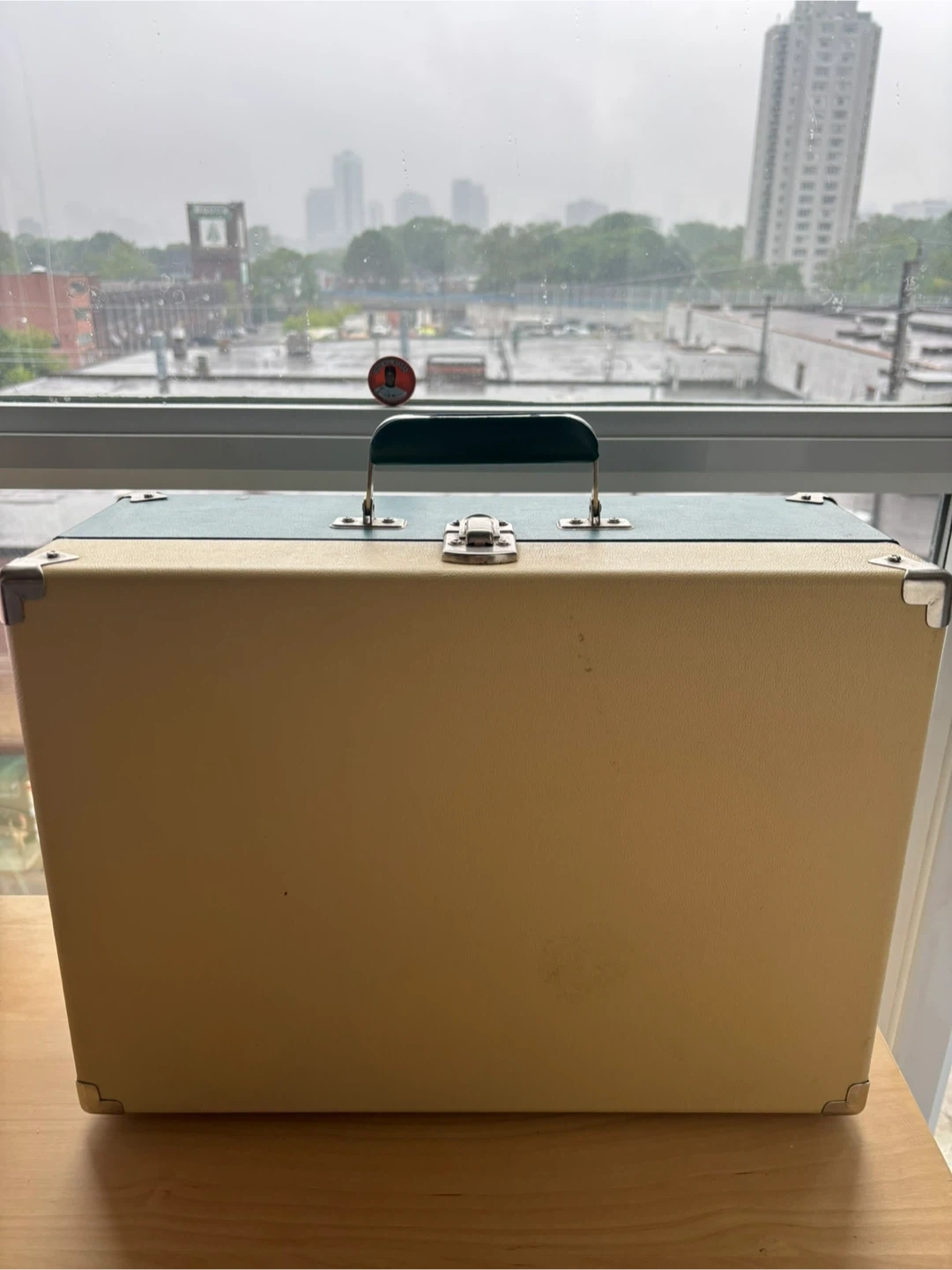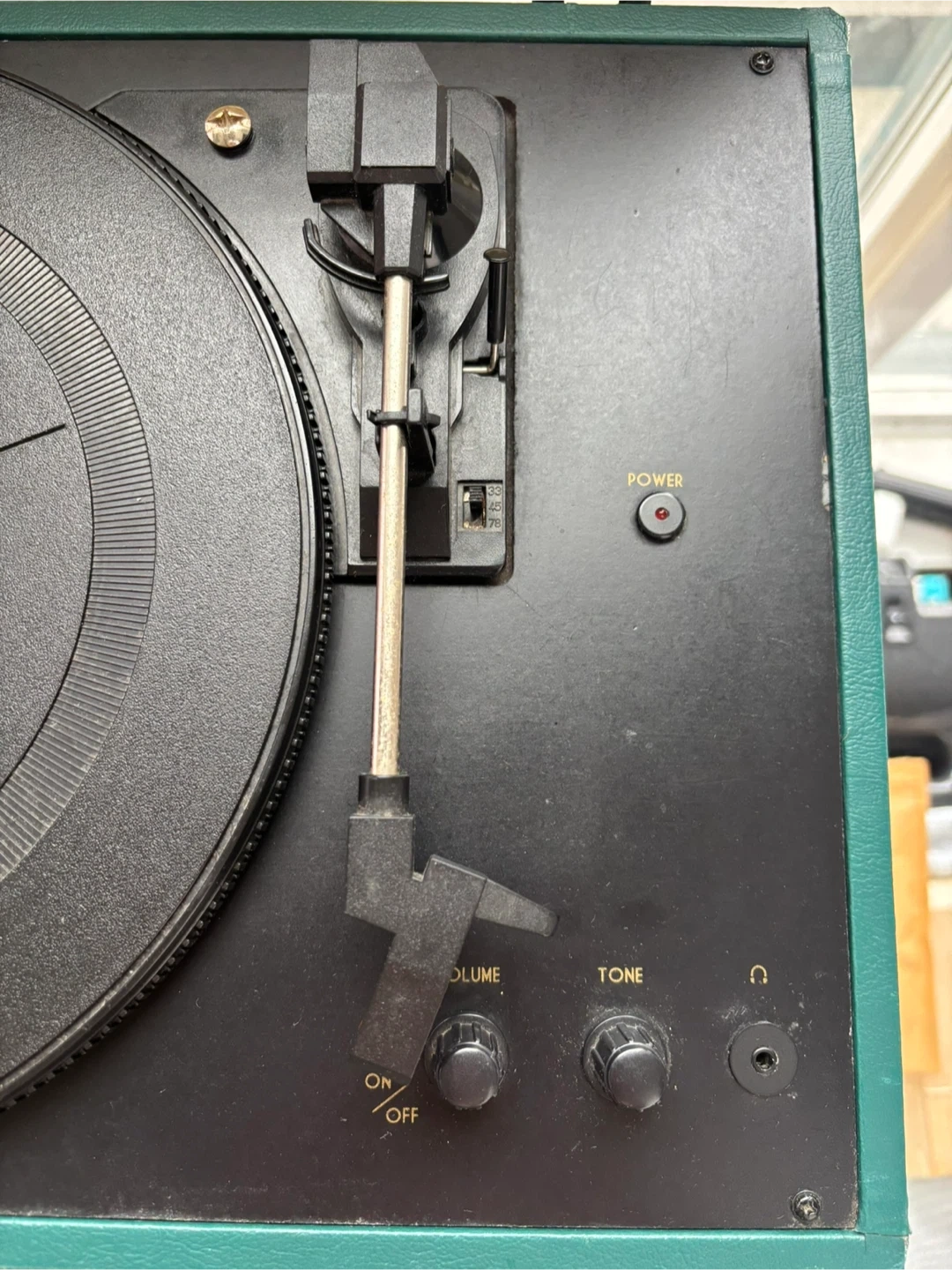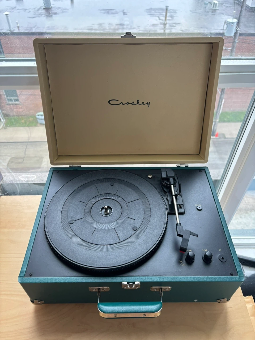 This is a Crosley CR6249A turntable record player in teal and cream. It was manufactured in November 2012. Includes AC/DC power adapter. Adapter wire is a bit damaged but it’s only cosmetic- it’s tapes and still works perfectly well.