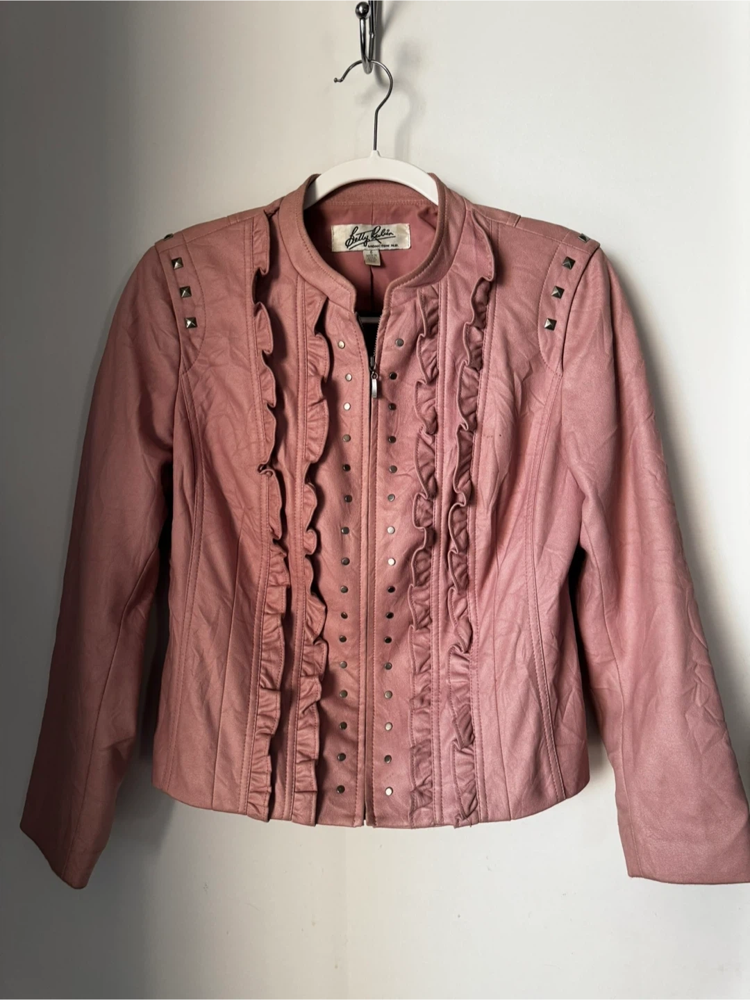 Betty Rubin pink faux leather jacket. It features a unique design with ruffles and studs down the front and shoulders. This jacket is a size 6 and made in China.
