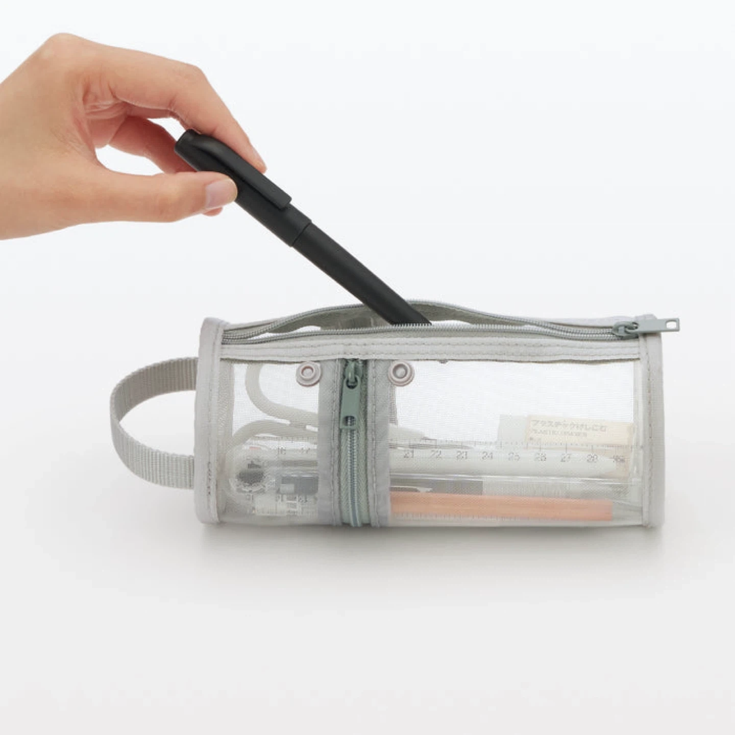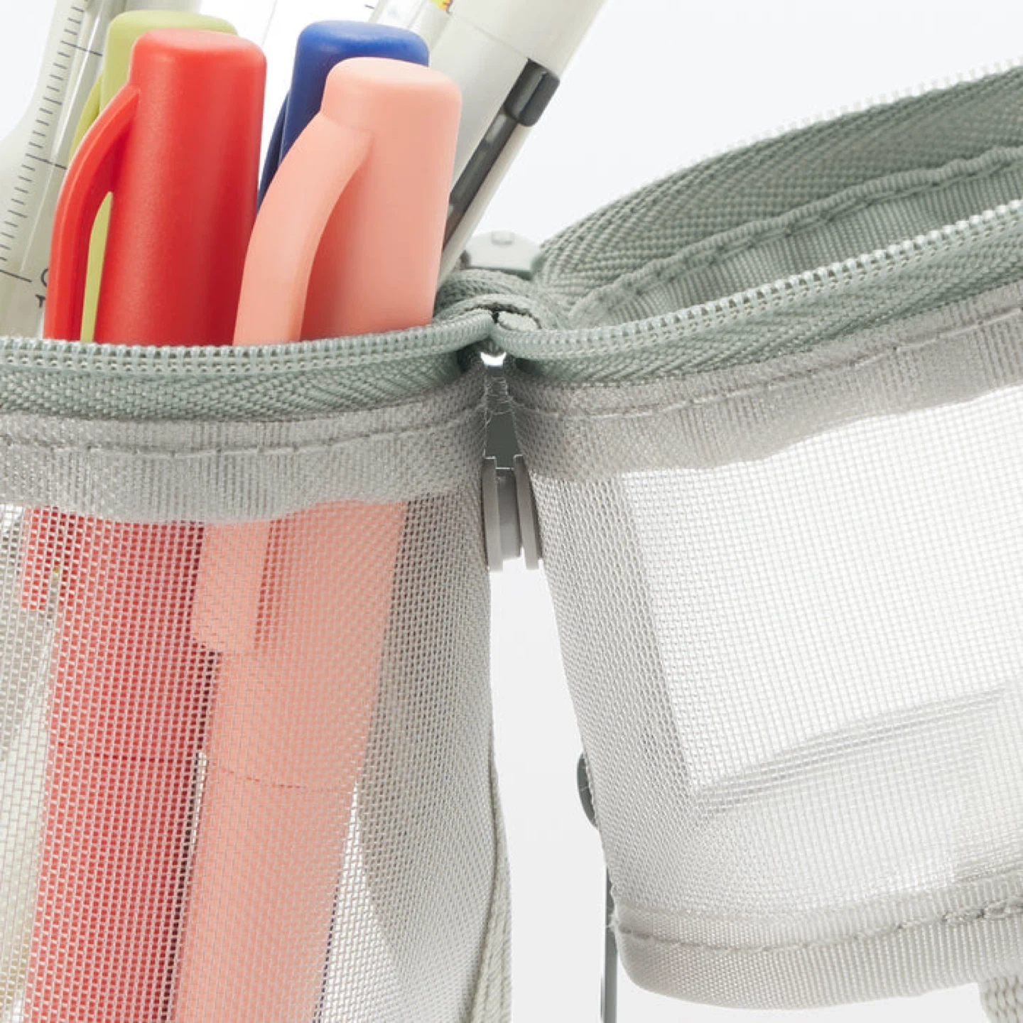This is a grey mesh pencil case with zippers. It has a handy loop for carrying. The transparent material makes it easy to see your supplies inside!