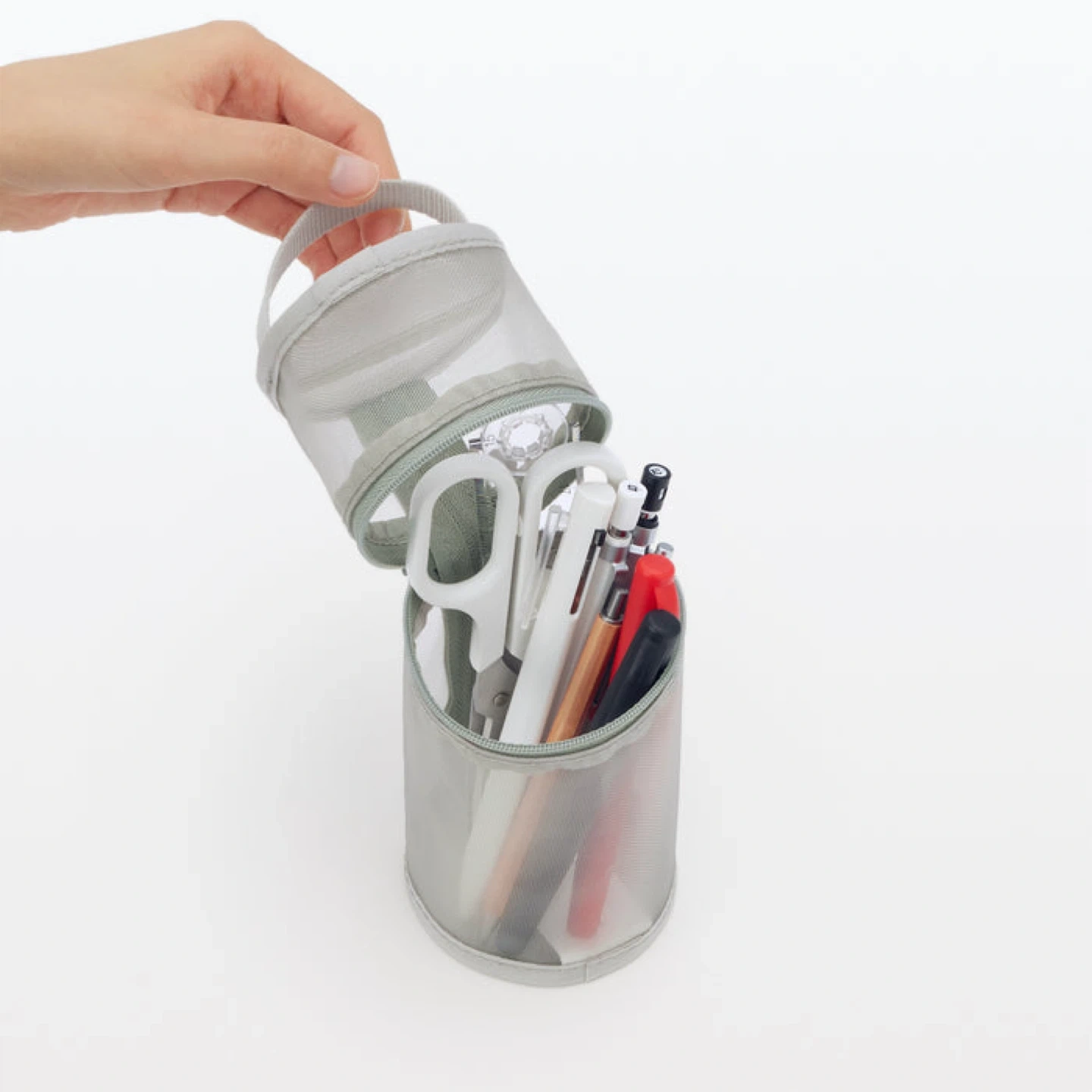 A pen case made of light and durable nylon mesh fabric, structured in a way that can open both horizontally or vertically for your convenience.