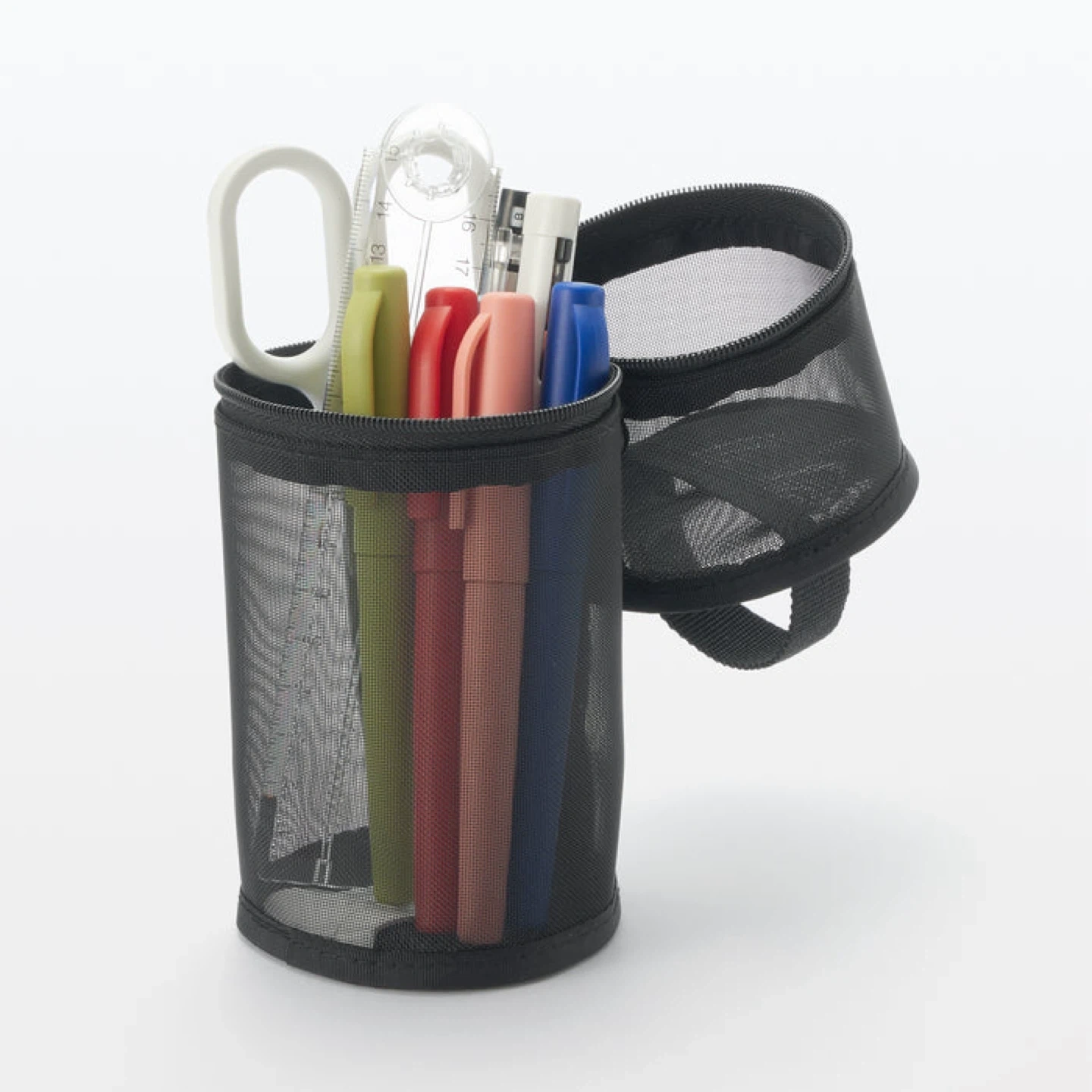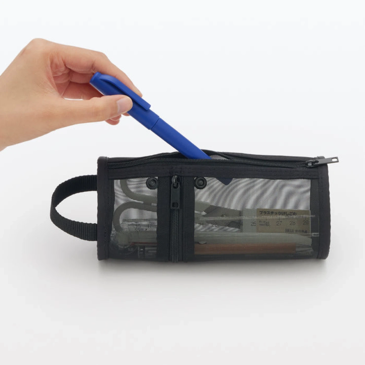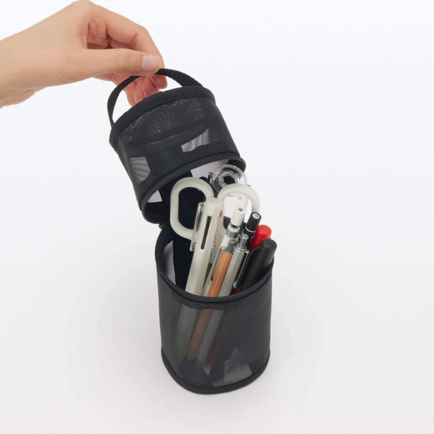 A pen case made of light and durable nylon mesh fabric, structured in a way that can open both horizontally or vertically for your convenience.