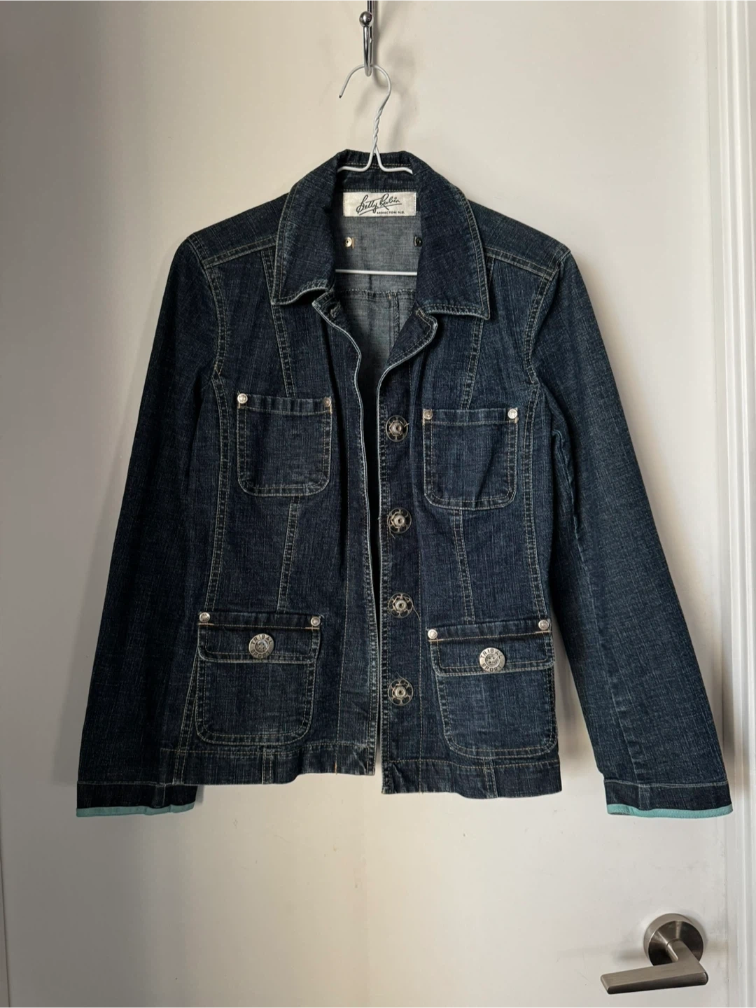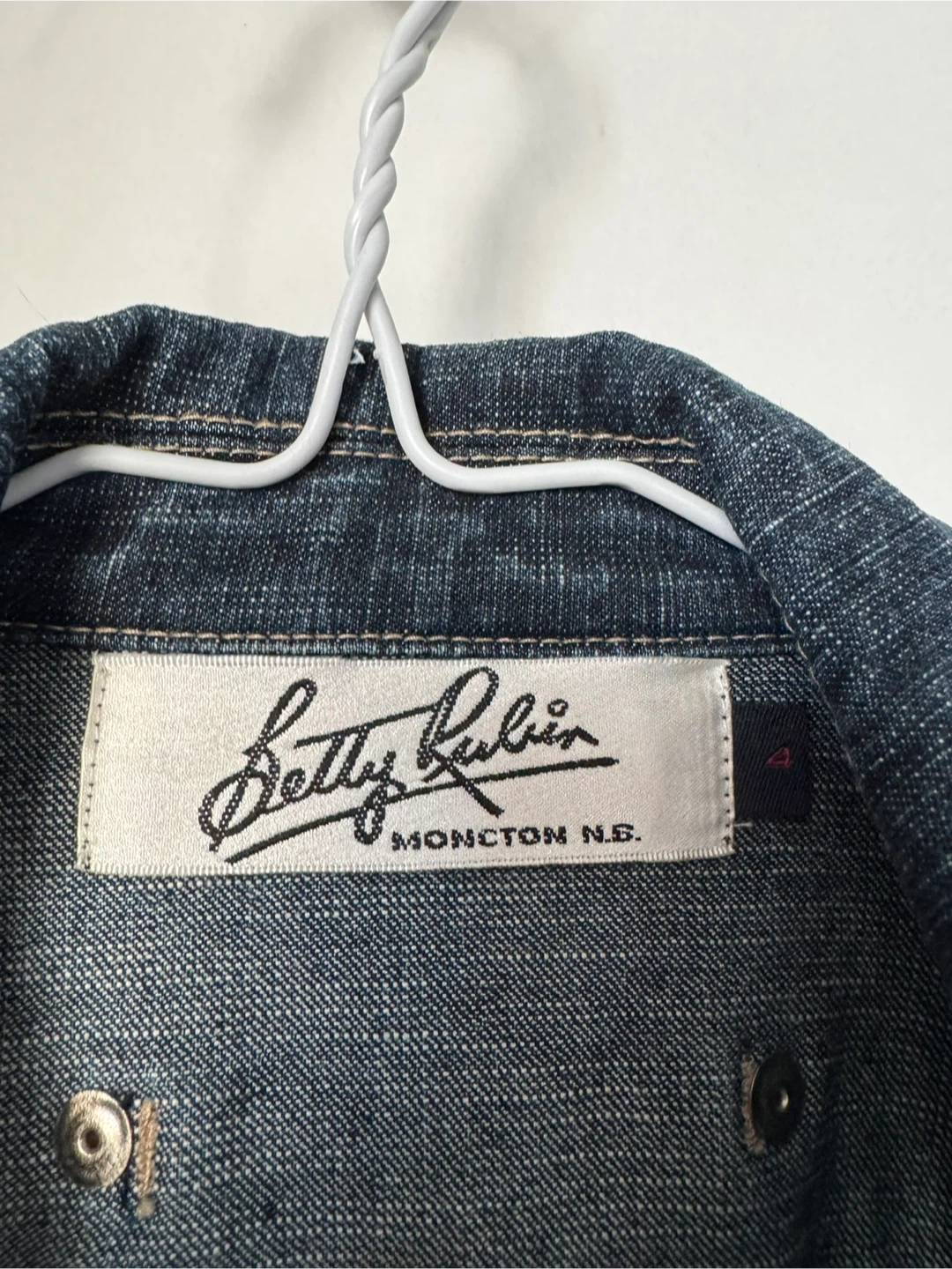 This Betty Rubin denim jacket is a classic staple. It features a dark wash denim material. The jacket is a size 4, perfect for layering.