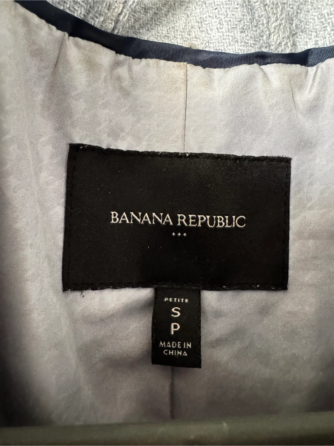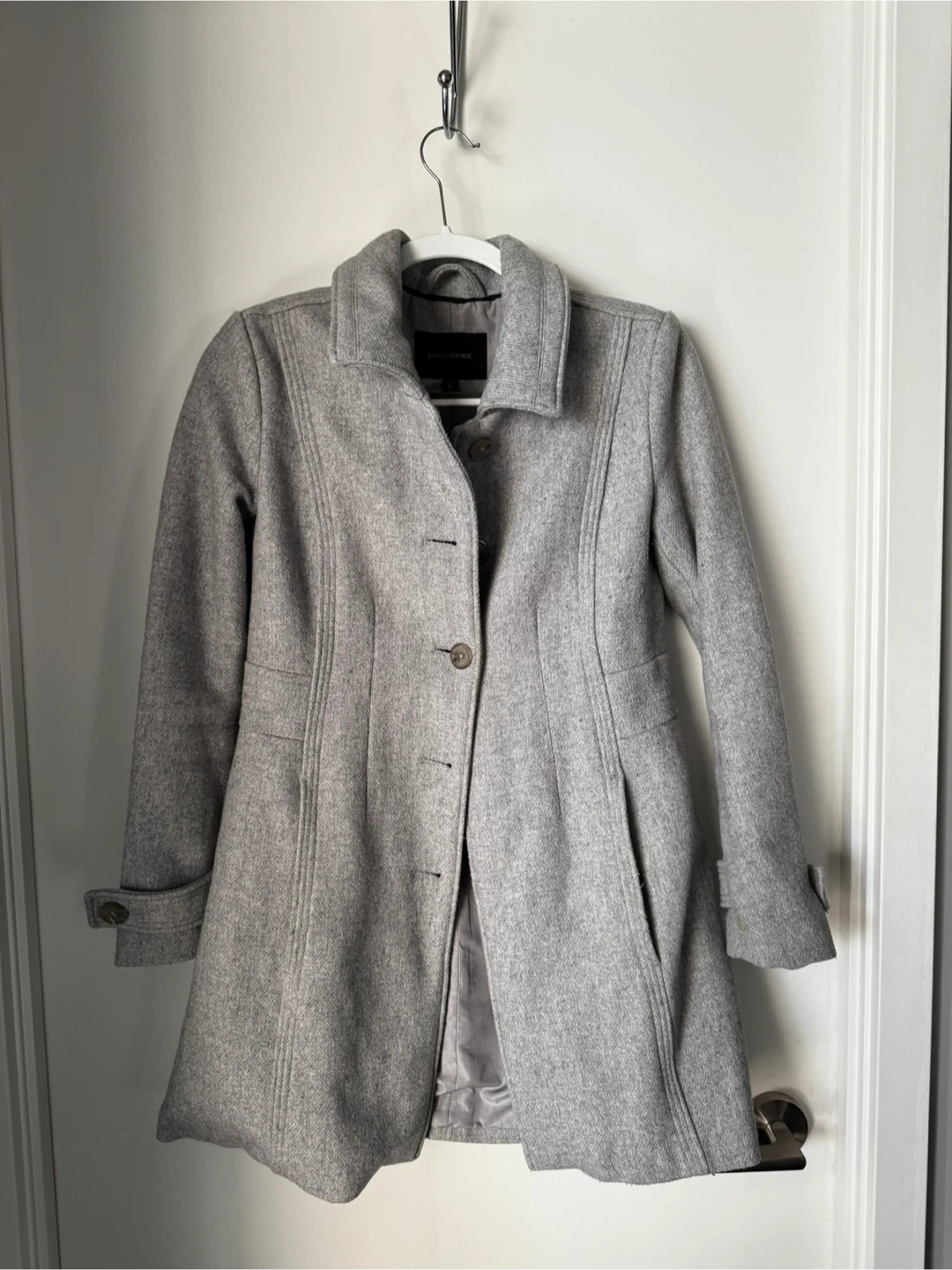 Banana Republic petite coat in a lovely grey colour. It's a size small. Made in China. This coat is perfect for cooler weather!