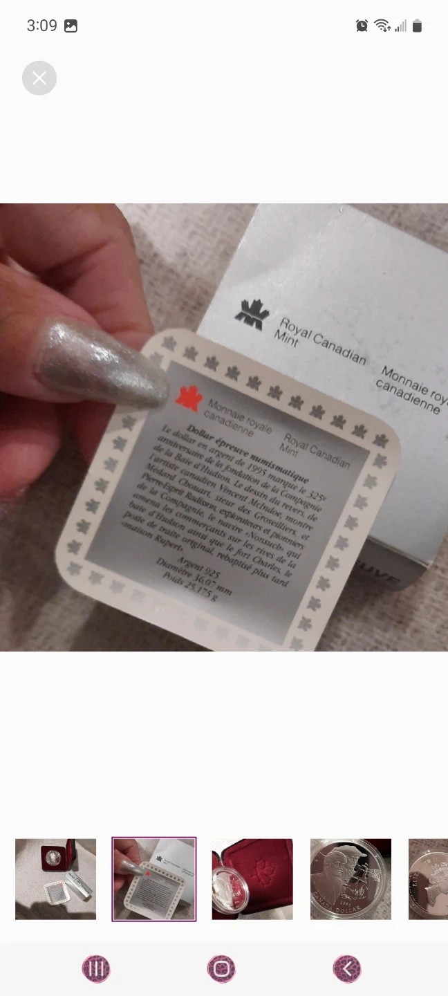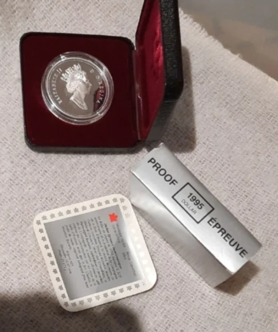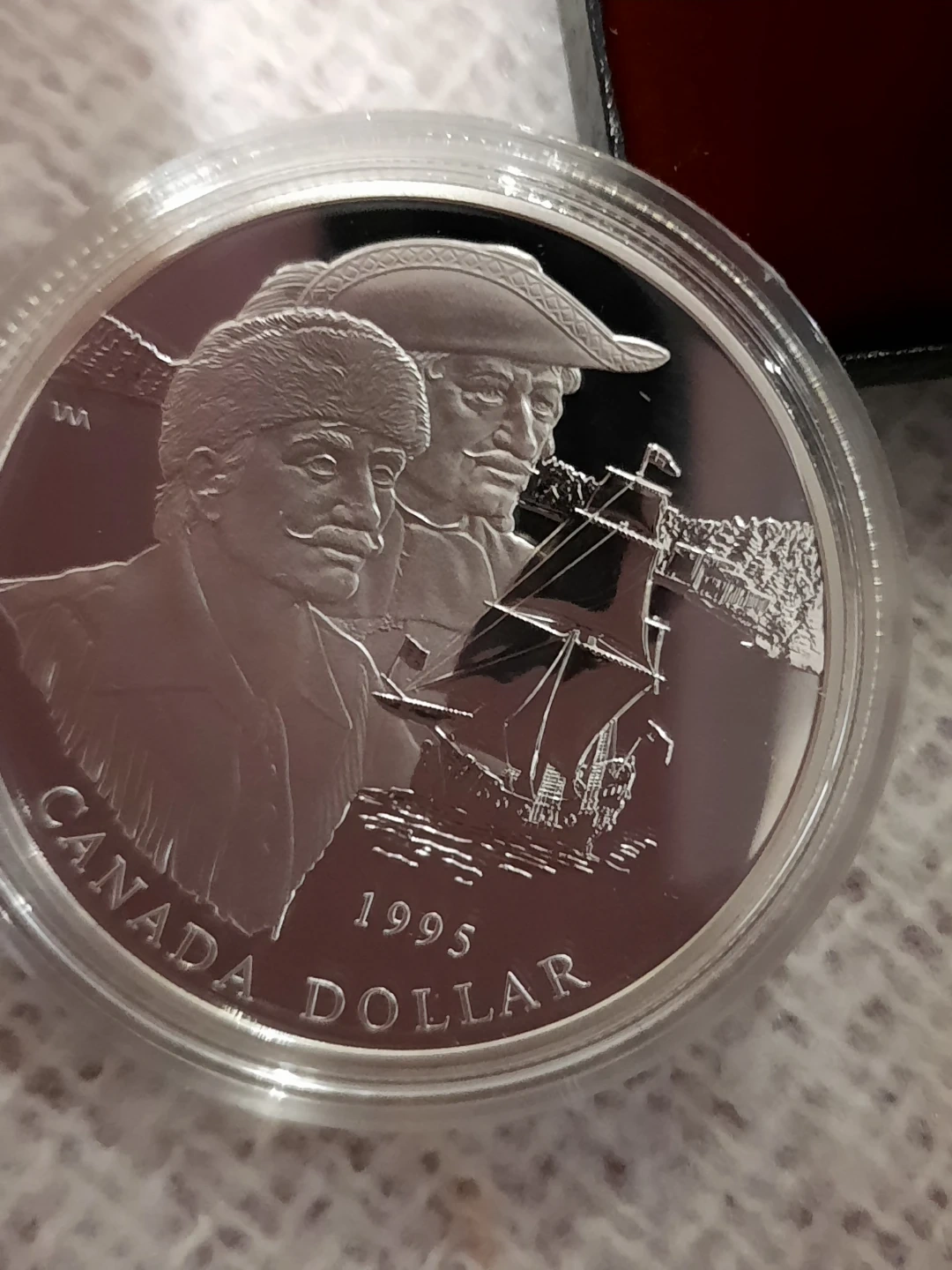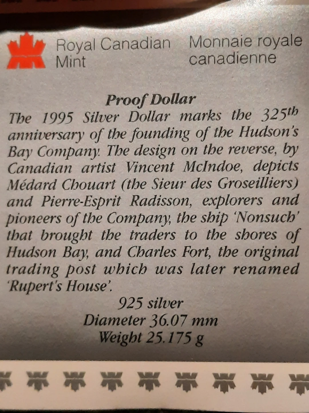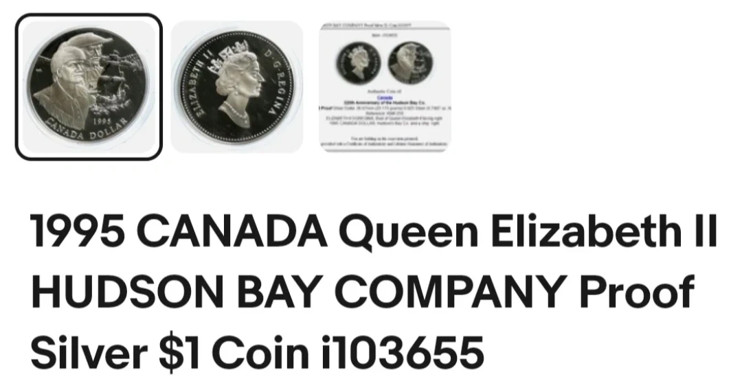 This is a 1995 Canada Dollar proof coin. It's made of 925 silver. Diameter is 36.07 mm and it weighs 25.175 g. This coin celebrates the 1995 Hudson's Bay Company anniversary.