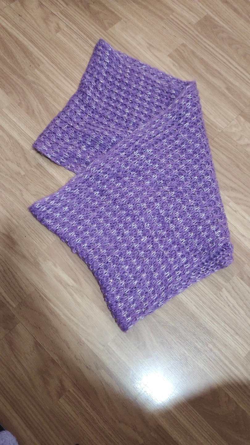 This is a cozy knit scarf in a lovely shade of purple. It's accented with shimmering silver thread throughout the pattern. It's a great accessory for chilly days!