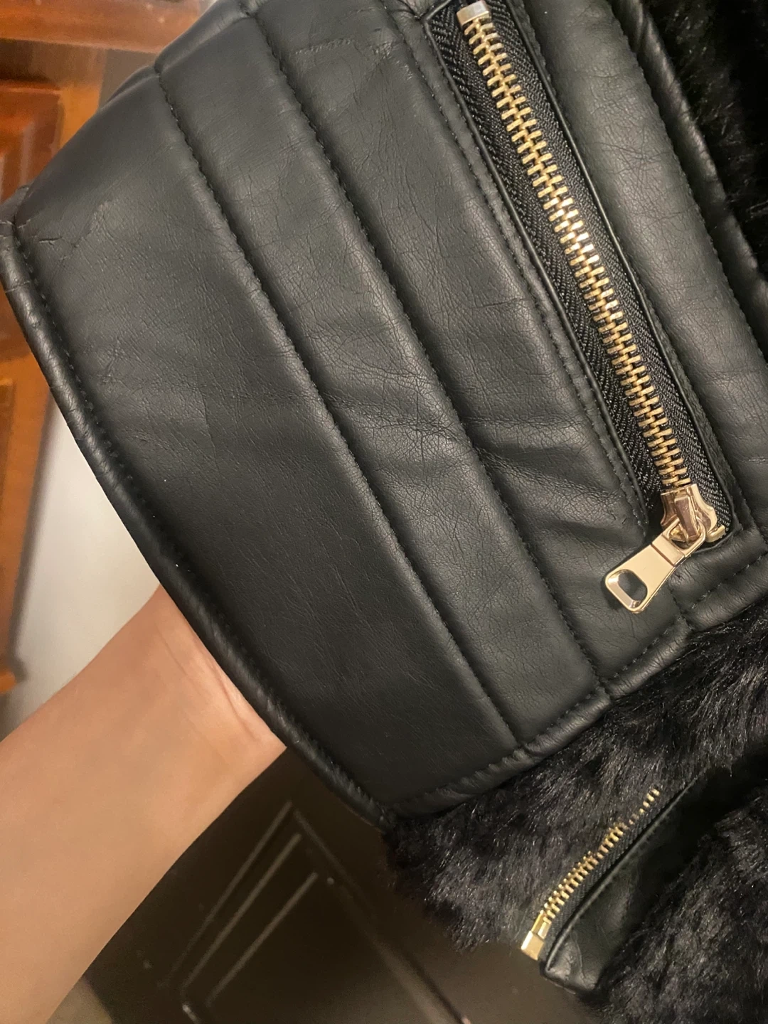 A stylish black vest featuring a faux fur top with a cozy cowl neck and a faux leather bottom. It has a zip-front closure and two zippered pockets. This vest is great for adding a touch of warmth and flair to any outfit!