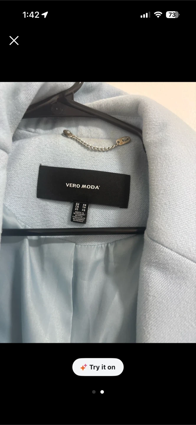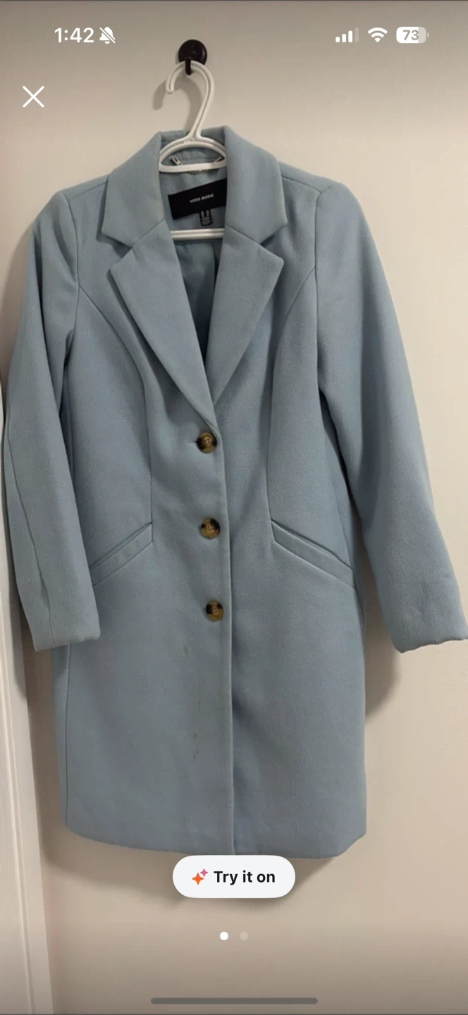 This is a Vero Moda light blue blazer for women. It's a size medium with a classic button-up front. The jacket is made with a soft fabric blend. It's suitable for layering over outfits for a polished look. Size xsmall pick up cash only