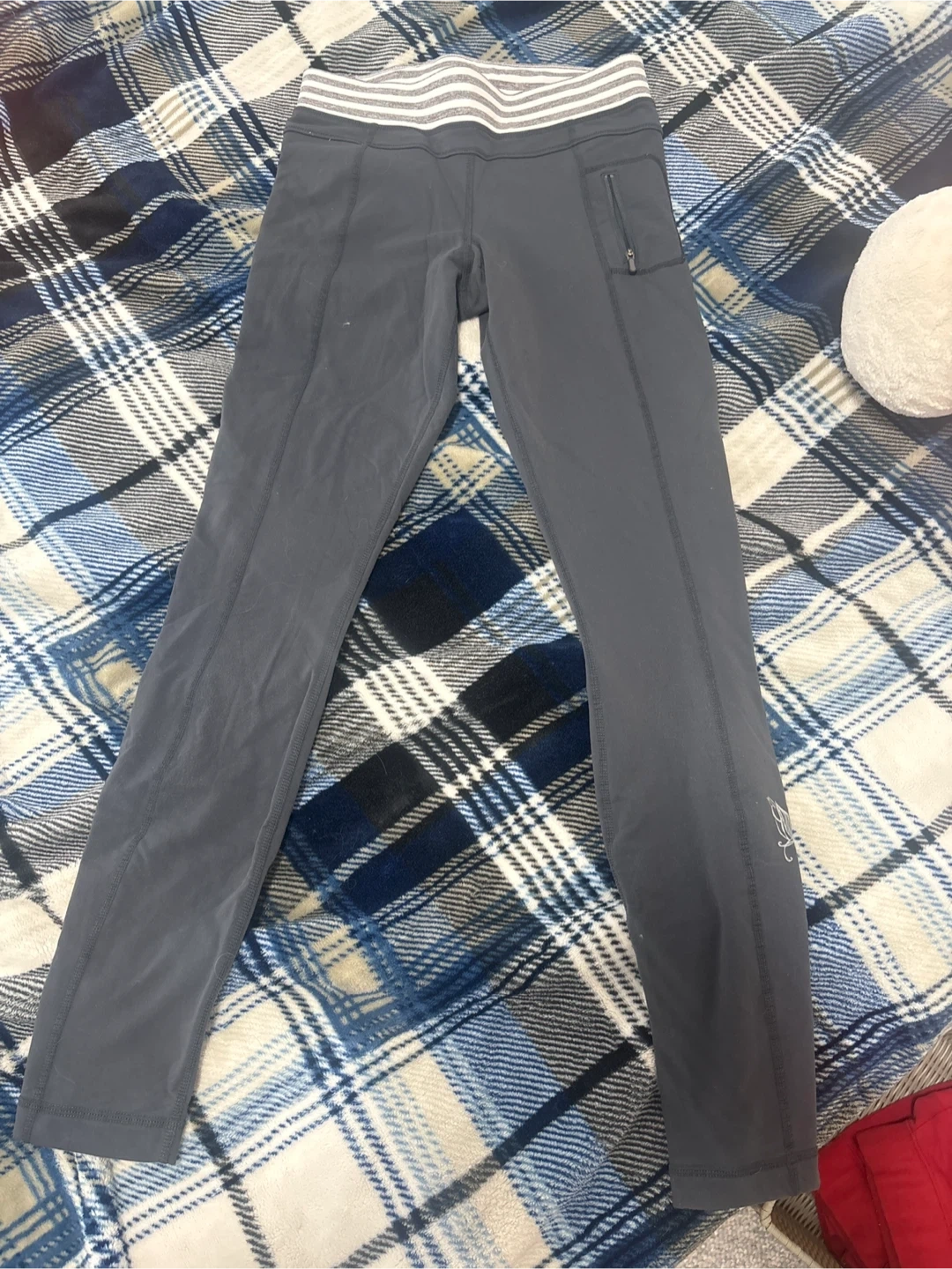 Grey Lululemon athletic pants with a striped waistband. It has a zippered pocket on the right hip and zippered ankles. These pants are great for workouts or running! Pick up cash only