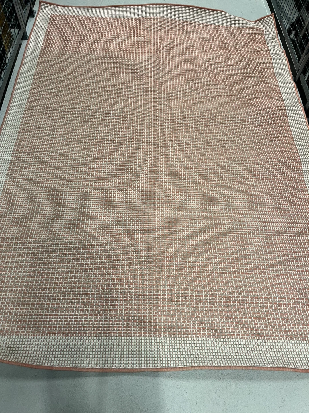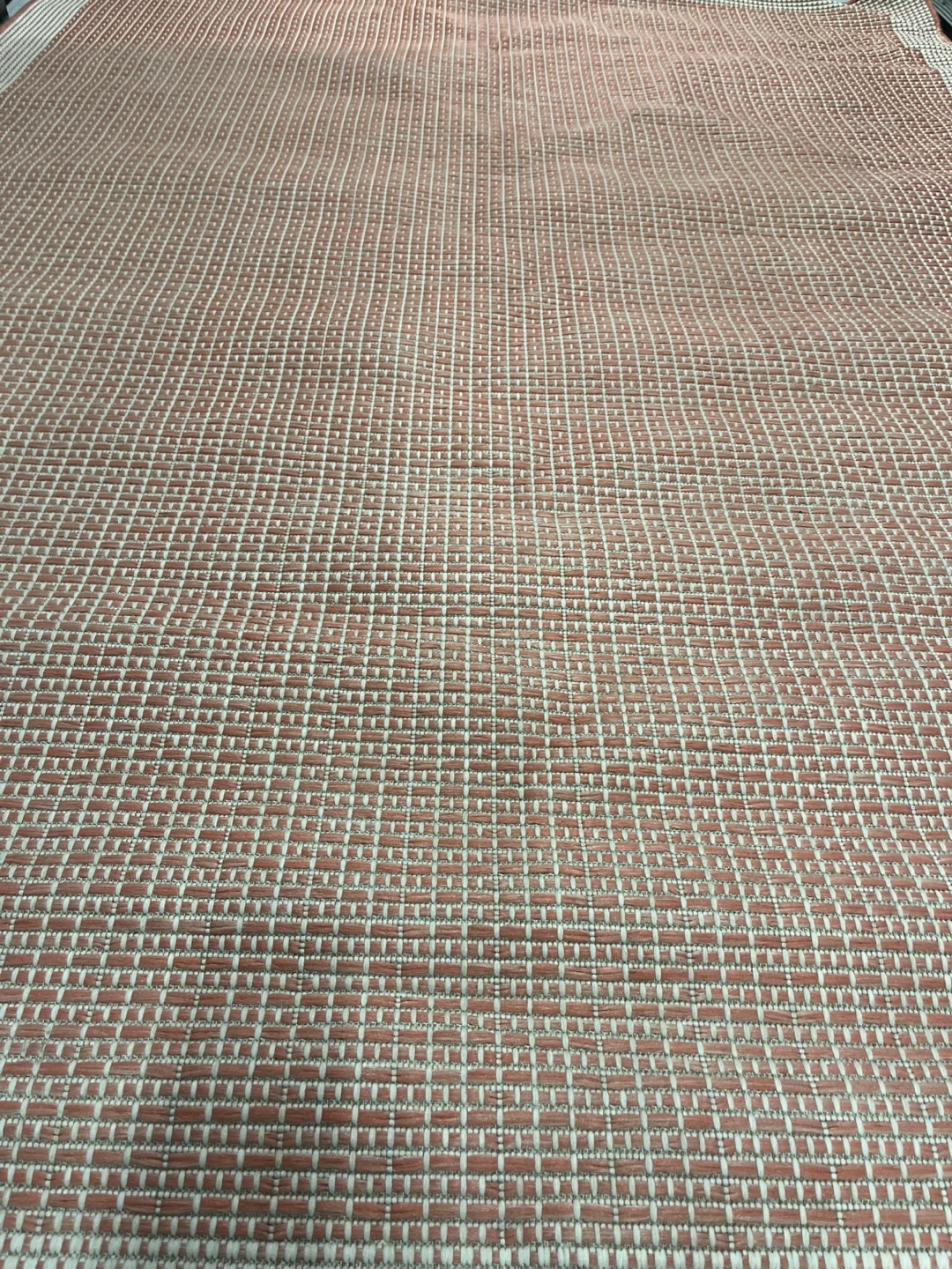This is a woven area rug. It's a salmon pink and white textured design. It has a durable woven construction.
