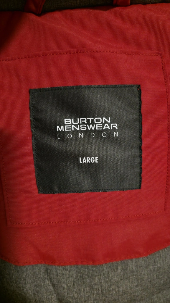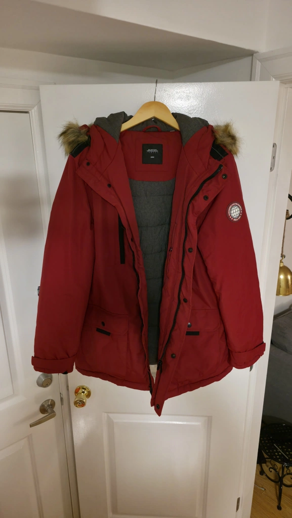 This Burton Menswear London parka jacket is a size large. It's red with a grey quilted lining and a faux fur trimmed hood. A warm and stylish outerwear piece for colder weather!